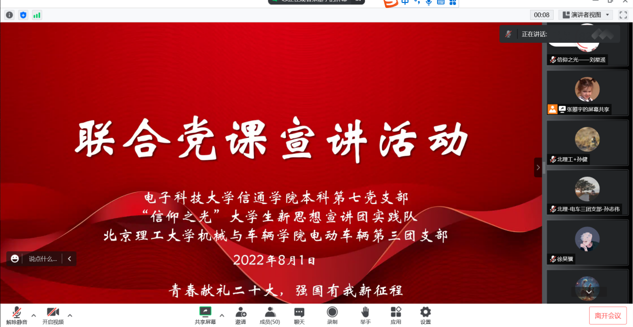 2022年8月1日,信通学院本科生第七党支部联合学院“信仰之光”大学生新思想宣讲团实践队与北京理工大学机械与车辆学院电动车辆第三团支部举行“青春献礼二十大,强国有我新征程”线上党团联学共建活动。本次活动是两院党团联学共建系列活动的第二期。活动伊始,双方学生代表以红色校史为主题进行线上微党课宣讲,共话使命担当。“信仰之光”代表成员李茂以“传承红色基因,走好科技长征路”为题进行微党课宣讲。从建校初期的听...