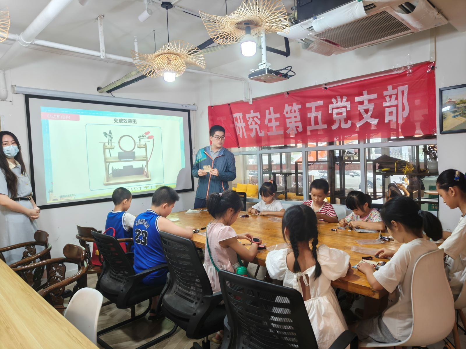 习近平总书记指出,“科技创新、科学普及是实现创新发展的两翼,要把科学普及放在与科技创新同等重要的位置”。为响应党的号召,8月23日,电子工程系研究生第五党支部在明远育美空间开展了“青禾讲堂”系列科普活动之“揭秘电动机”,围绕电动机的工作原理,深入浅出地为小朋友进行了讲解和实操。在分享会上,支部杨博文同志首先向参加的小朋友介绍了电动机的基本原理,并通过简单的实例解释了电动机的工作过程。随后,他向小朋...