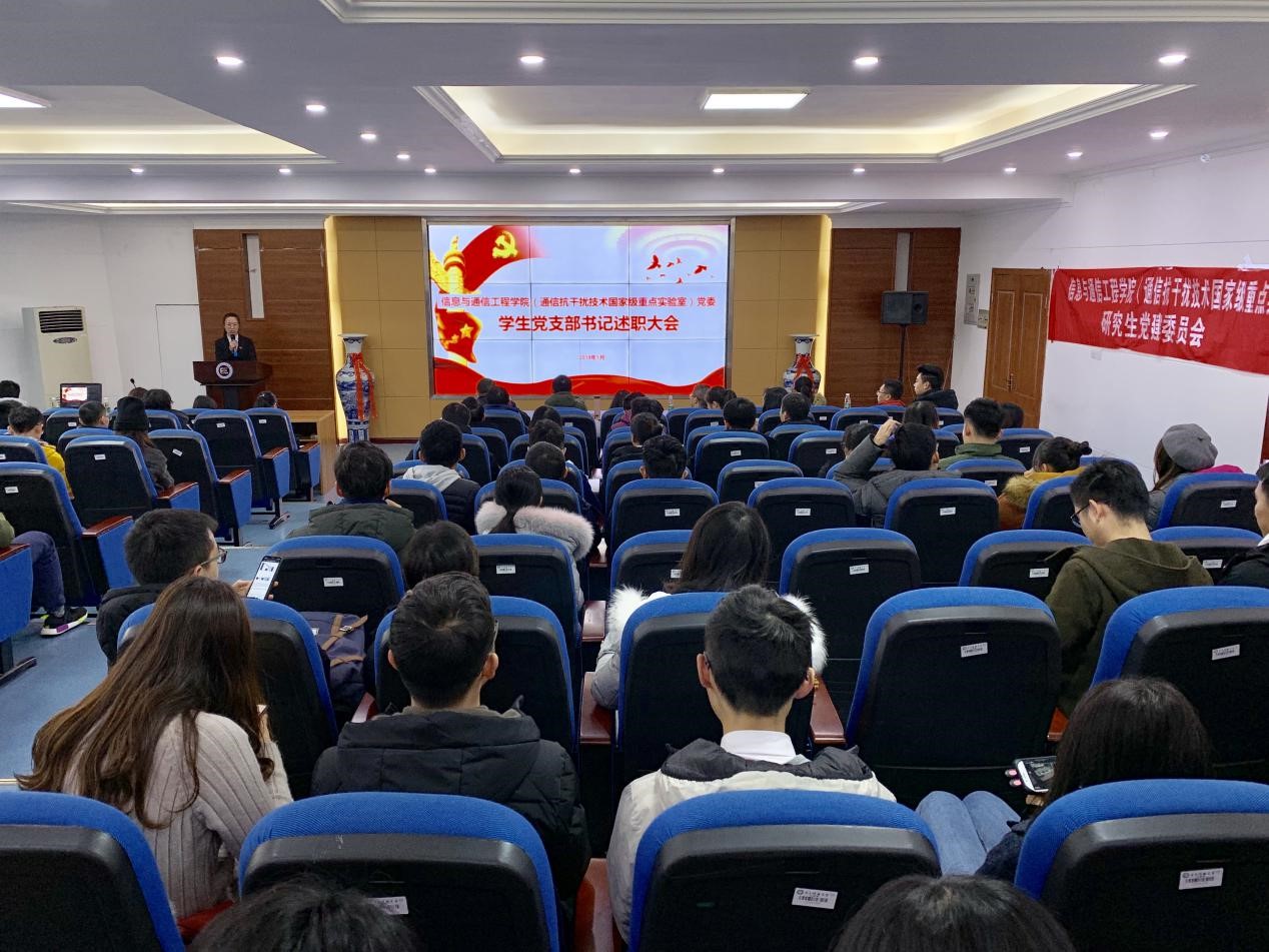为深入学习贯彻党的十九大精神和习近平新时代中国特色社会主义思想,进一步推动全面从严治党向基层延伸,提升学生党支部组织力,充分发挥支部战斗堡垒作用,william英国中文(通信抗干扰技术国家级重点实验室)党委在科研楼C216举办学生党支部书记述职大会。学院党委书记李玉柏,党委副书记黄海、杨晓玲,组织员孙清平、余万宏,学生科辅导员老师们以及各学生支部书记、委员参加了此次会议。大会伊始,李玉柏为本次会议致...