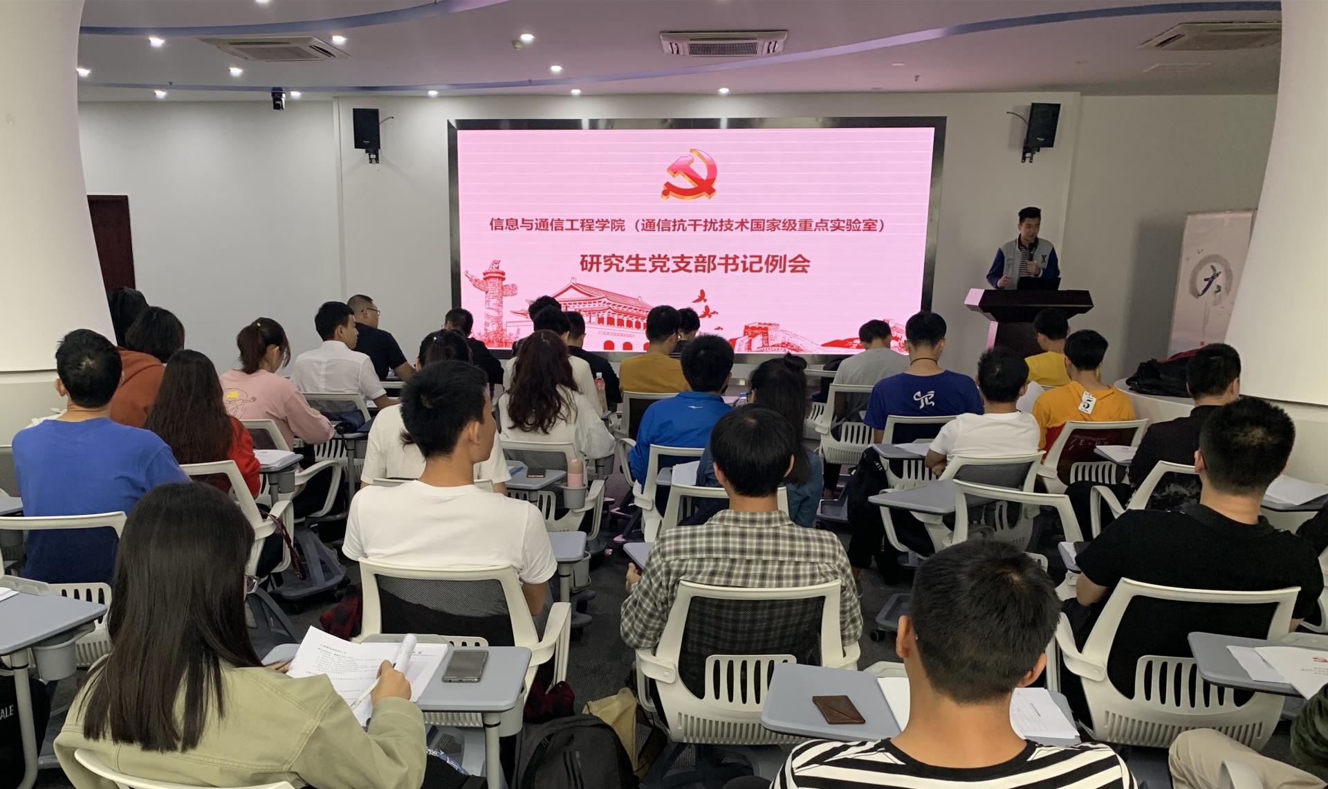 9月18日,信息与通信党委于图书馆百学堂召开本学期第一次研究生党支部书记例会。辅导员匡鹏举老师、全体研究生党支部书记及党建委员会成员参加了此次会议。本次会议布置了本学年党建委员会与支部对接的相关事宜,介绍了党建委员会同志和对接安排。明确提出了支部对接实施细则,即每周一次线上交流、每月一次线下检查材料、每季度至少参加一次对接支部的活动、每学期一篇书面报告,同时希望各位党支部书记积极开展党支部活动,主...
