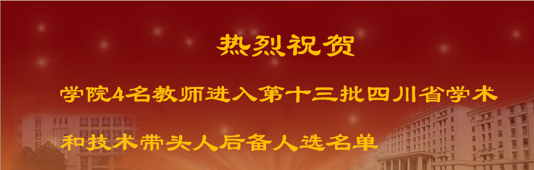 近日,根据《四川省人力资源和社会保障厅等八部门关于印发第十三批四川省学术和技术带头人后备人选名单的通知》,我院王子南、王坚、易伟、黄勇军(以姓氏笔画为序)4名教师进入第十三批四川省学术和技术带头人后备人选名单。 四川省学术和技术带头人后备人选是四川省实施人才强省战略,推进新时代治蜀兴川事业全面发展的生力军,是全省各行业领域的高层次学术技术骨干人才,是省学术和技术带头人的重点培养对象。 本次省学...