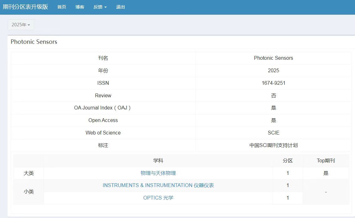 近日,受国内学术界高度关注的中国科学院文献情报中心2025年期刊分区表正式发布,我校主办的《Photonic Sensors》(简写为PhoS,中文刊名为《光子传感器》)首次进入中科院期刊大类分区的物理与天体物理1区,小类分区的仪器与仪表与光学1区。这是继PhoS于2023年首次进入JCR Q1区和中科院2区后,再次取得的突破性进展。PhoS作为我校信息与通信工程A+学科唯一的国际学术期刊,横跨仪器仪表与光学两个学科,对提升我校信息与通信工...