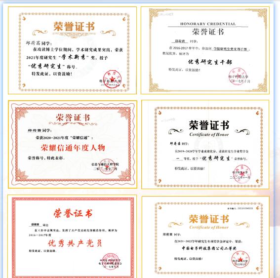 功夫不负有心人,在攻读博士学位期间,邱荷茜厚积薄发,在科研实践中摘取众多优异成果,入选首批四川省博新计划、2022年度成电杰出学生、荣耀信通年度人物、williamhill官网“学术新秀”,并荣获川渝博士后学术成果展示一等奖、学业一等奖学金、深圳证券交易所奖学金、中电集团专项奖学金等诸多荣誉。
