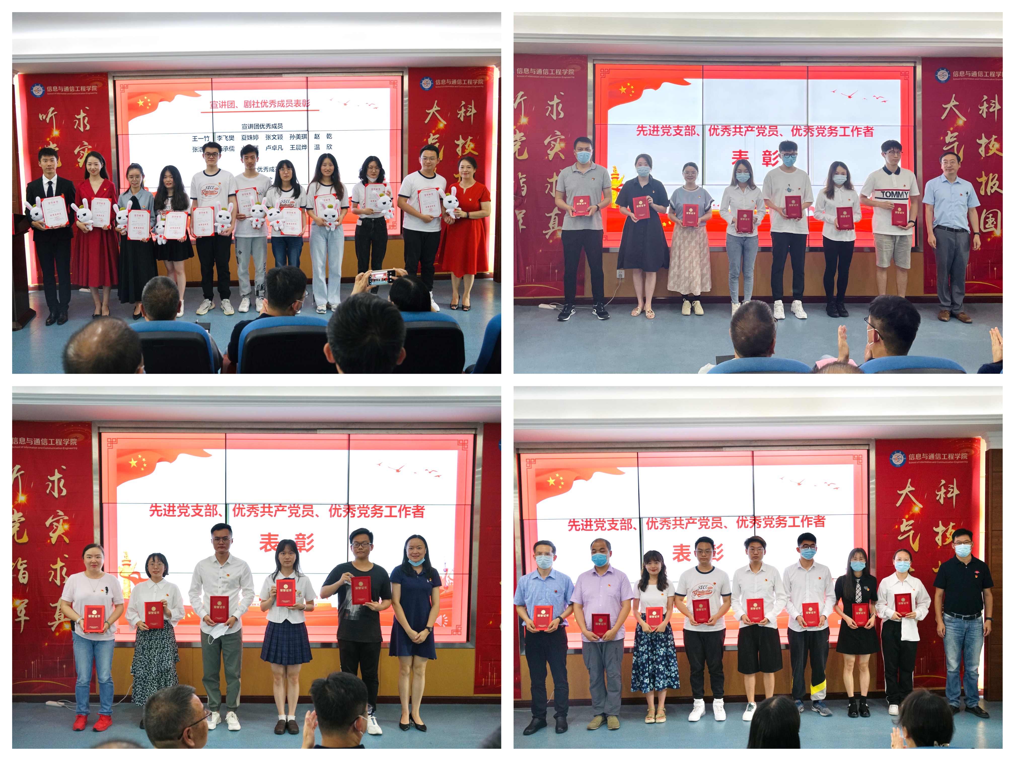 随后进行颁奖仪式,对20个先进党支部、60名优秀共产党员、25名优秀党务工作者、20个优秀党日活动以及“信仰之光”大学生新思想宣讲团和“星光”大学生红色文化原创剧社优秀毕业生进行表彰。