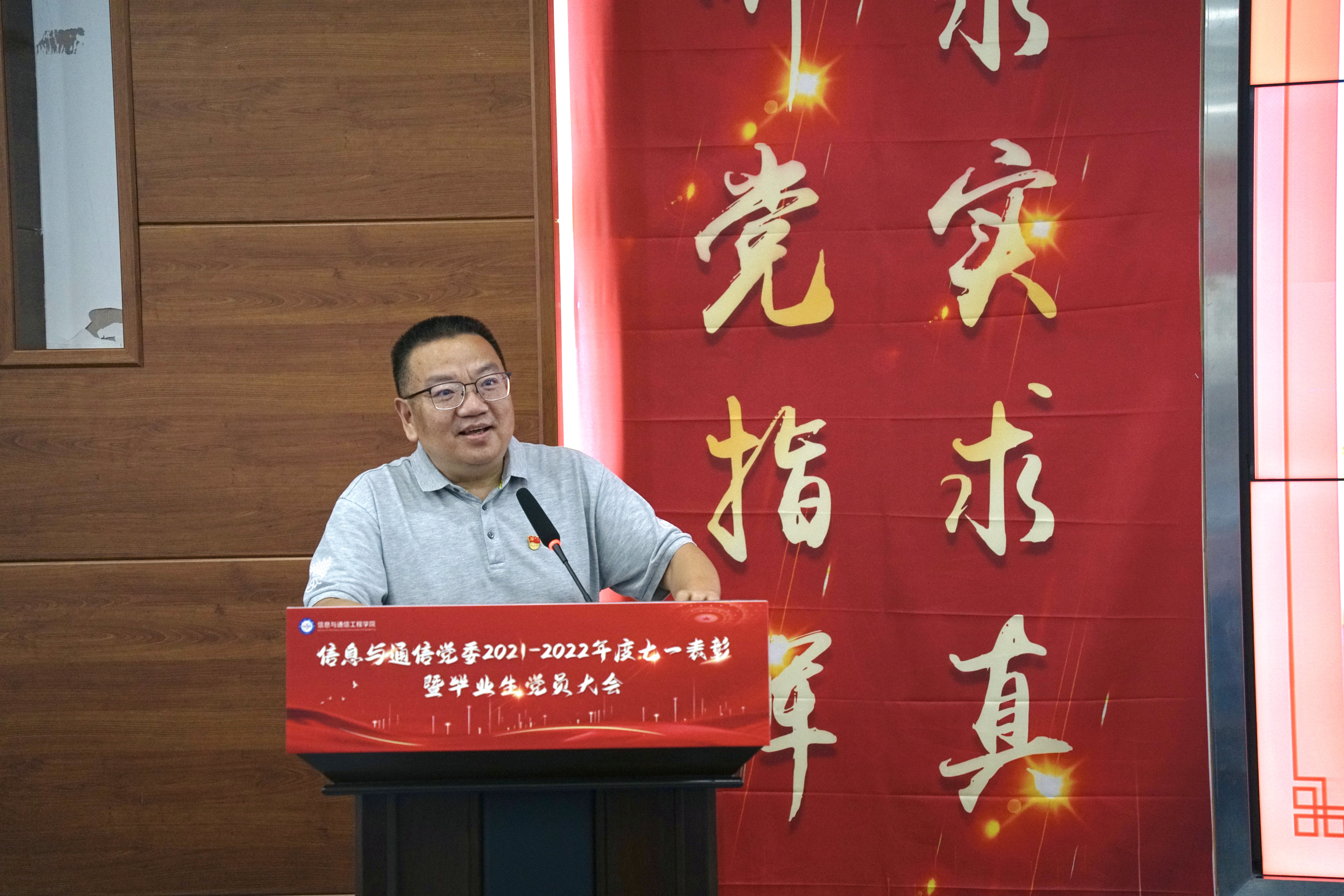 首先由学院党委书记李玉柏致辞,李玉柏对过去一年信息与通信党委带领学院和重点实验室在各项工作中取得的突出成果进行了总结回顾,并对即将毕业的党员同学提出了三点希望:一是传承红色基因,赓续精神血脉;二是强化价值引领,服务国家战略;三是坚定理想信念,争当先锋表率。讲话最后,李玉柏对全体毕业生党员表达了祝愿,鼓励大家在青春的赛道上跑出当代青年的最好成绩,在民族复兴的伟大征程中实现人生理想。