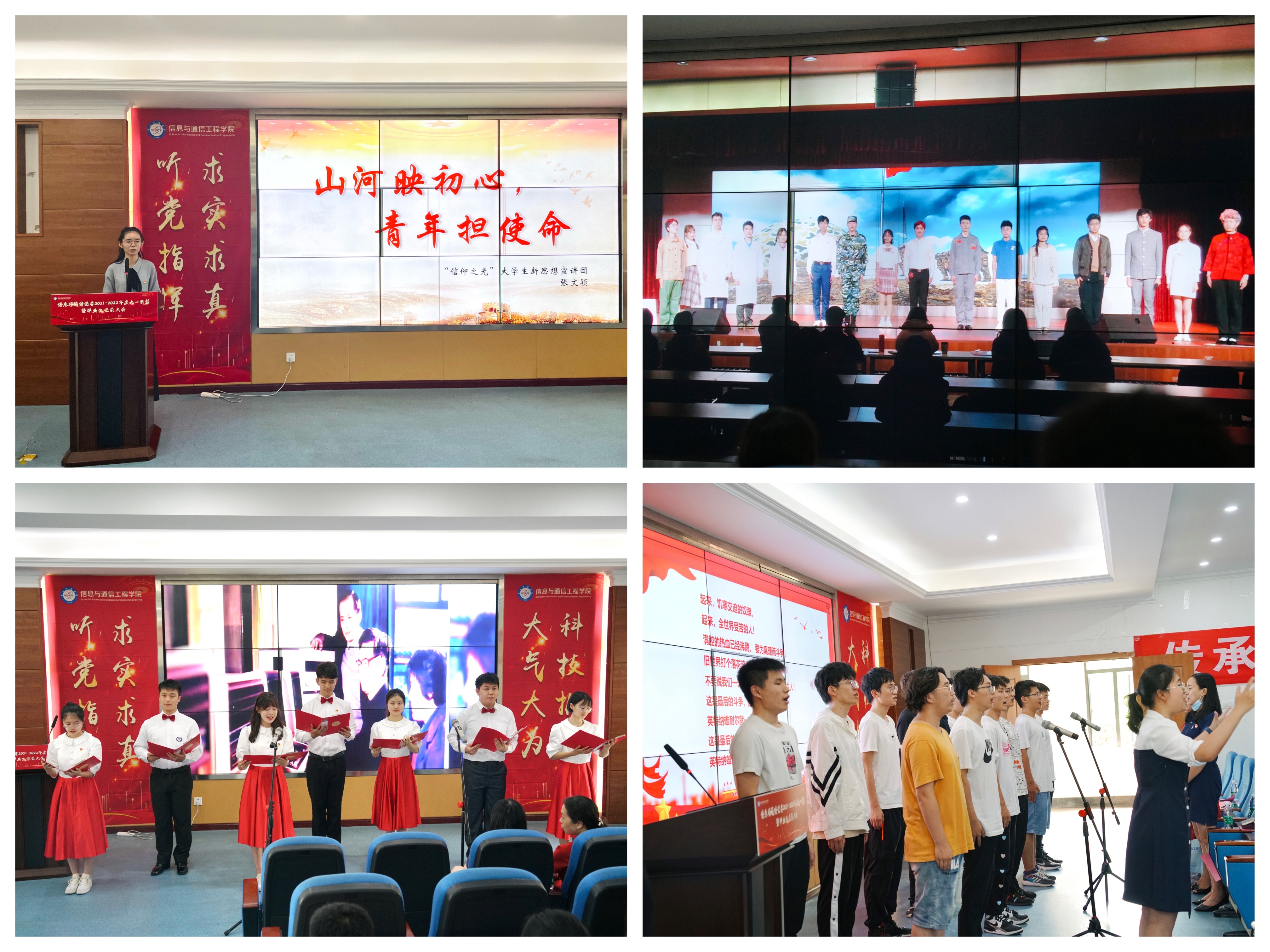 此次大会不仅对学院党委过去一年的工作进行了全面回顾与经验总结,同时引导广大师生党员将责任与使命铭记于心,并在今后的工作学习中不断践行,以实际行动迎接党的二十大胜利召开。自2018年以来,信息与通信党委充分挖掘学校办学发展中的学科特色元素,凝练红色文化育人成果。由“5月的向日葵”辅导员工作室构建“红色理论宣讲、红色影片赏析、红色歌曲传唱、红色诗歌创作、红色影视配音、红色话剧演出”于一体的红色文化传播体系,将党史与校史院史、学科发展史、专业发展史相结合,打造了一批突出成电特色、学科特点的红色文化原创作品,旨在传承红色基因,讲好成电故事。未来,信通党委将以“传承红色基因,赓续精神血脉”为主题,丰富红色文化育人成果。