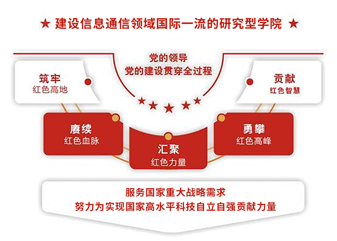 学院把坚持和加强党的全面领导和党的建设贯穿始终,依托“信息与通信工程”A+学科特色优势,精心打造“筑牢红色高地、赓续红色血脉、汇聚红色力量、勇攀红色高峰、贡献红色智慧”五个红色工程,全面增强基层党组织政治功能和组织力。