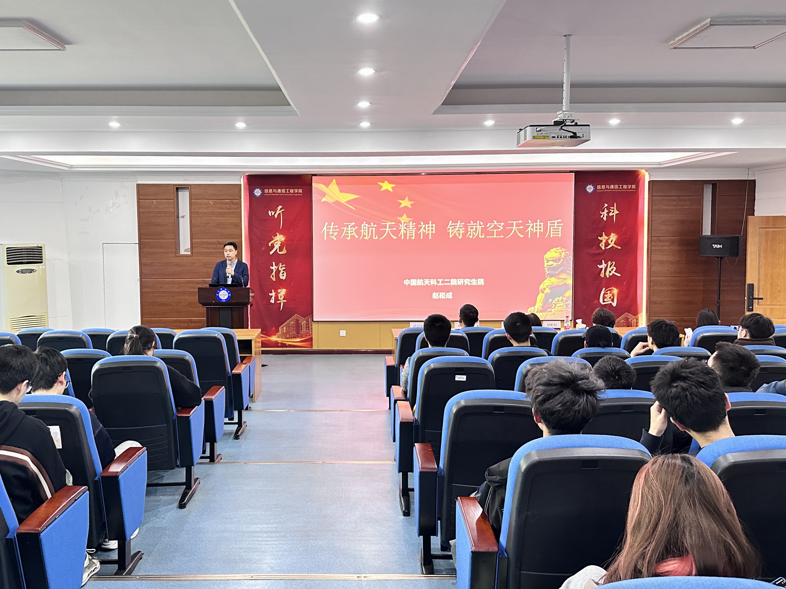 红旗宣讲团成员面向本科生开展《传承航天精神,铸就空天神盾》专题报告,讲述党的领导下航天事业的跨越和腾飞。未来信通学院将持续邀请宣讲团围绕中国共产党人精神谱系中与航天文化相关的载人航天精神、探月精神、北斗精神、两弹一星精神开展系列专题辅导报告。