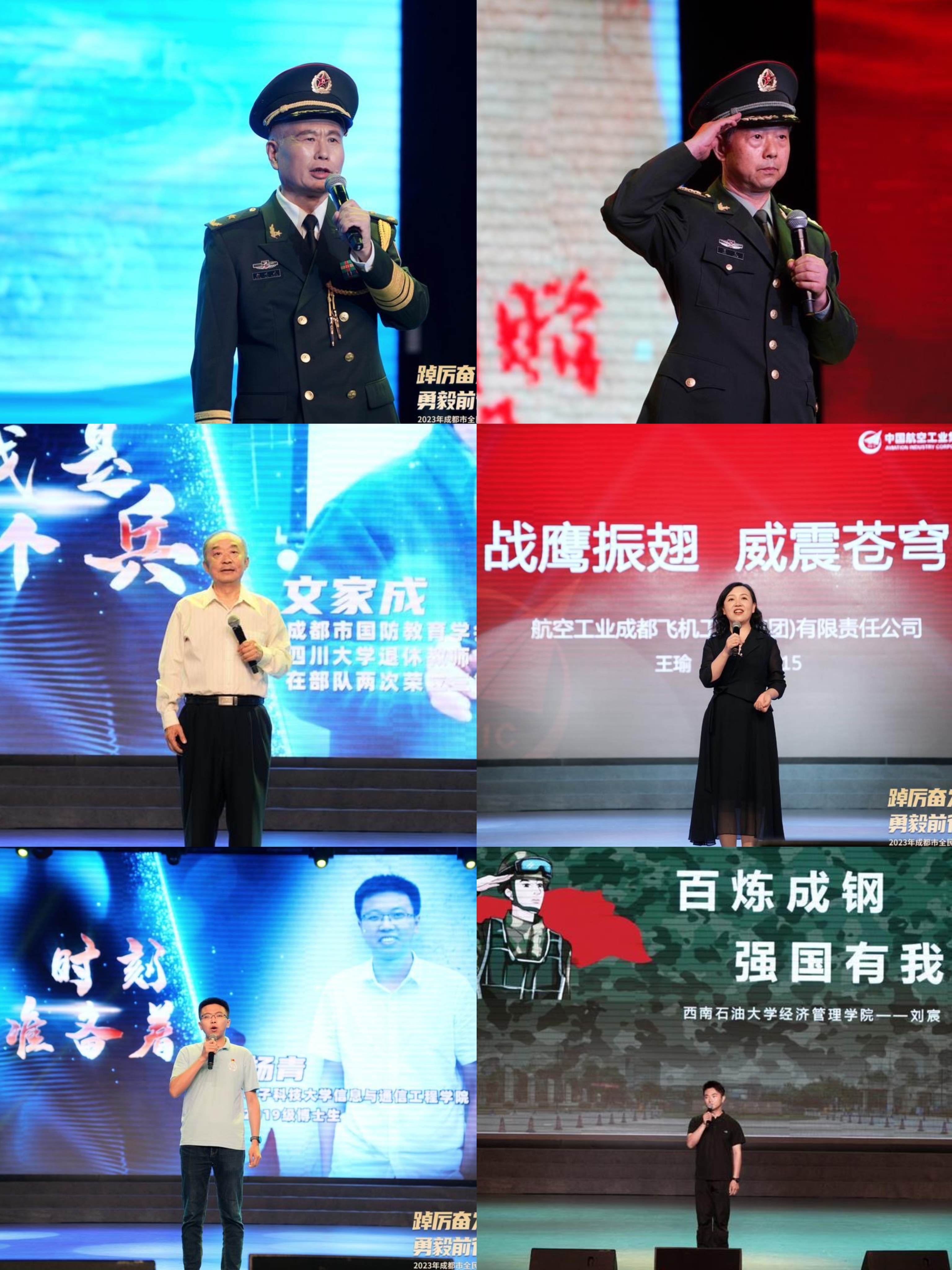 本次主题宣讲活动亮点纷呈,活动现场邀请到老、中、青三代国防典型人物现身说法、生动开讲。原成都军区政治部副主任郑道光、泸州军分区原司令员范良、成都飞机工业集团公司党校金牌教师王瑜、退役军人四川大学退休教师文家成、信通学院博士生党员杨青围绕“厚植家国情怀、科技强国强军”带来精彩宣讲,深入宣传阐释国防重要意义、政策法规、革命历史和时代要求等内容。
