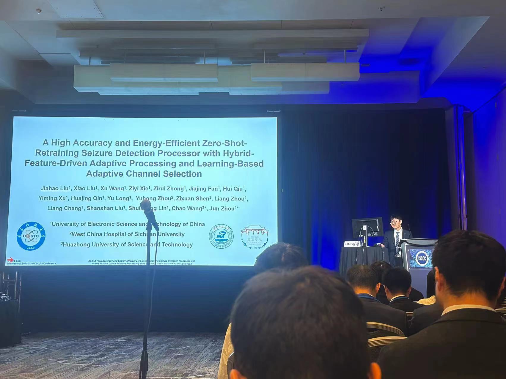 另一款芯片是超低功耗脑电识别AI芯片。近年来,随着脑机接口、脑电监测等应用兴起,基于深度学习的智能脑电识别设备可以实现诸如癫痫检测、意念控制、情绪感知、睡眠监测等功能。然而,现有设计面临两个问题:1. 为解决用户差异性带来的准确率问题,需要采集用户的脑电数据用于增量训练,如癫痫检测任务需要采集用户的癫痫数据,由于该类数据出现频率低,需要数周甚至数月入院监测,实用性较差。2. 深度学习技术的引入导致功耗上升,不适合穿戴式脑电设备。针对以上挑战,周军教授带领学生设计并实现了一款超低功耗脑电识别AI芯片,提出了融合机器学习和深度学习的自适应AI处理架构、小样本片上在线学习电路和基于在线学习的自适应脑电通道筛选电路等多项技术,降低了对用户样本的需求,同时实现了极低处理能耗。在癫痫检测任务中,该芯片在不需要采集病人癫痫信号的前提下,准确率达到98%以上,同时平均每次识别能耗仅为约0.07微焦,达到了国际同类设计最低能耗,相比发表在ISSCC 2023的最新工作,准确率提升了近10%,能耗降低了90%以上。该芯片支持神经网络编程和多通道脑电处理,还可用于脑机接口、睡眠监测等应用。该论文被ISSCC TPC委员会评为ISSCC 2024亮点论文,williamhill官网为第一单位,四川大学华西医学院和华中科技大学为联合单位。第一作者为周军教授的博士生刘嘉豪,周军教授和华中科技大学王超教授为共同通信作者。