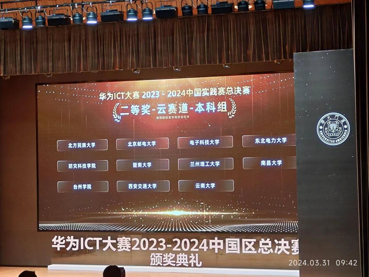 2024年3月30日--31日,第八届华为ICT大赛2023年--2024年全国总决赛暨颁奖典礼在厦门大学翔安校区举行。在实践赛道中,我校4支代表队以四川省本科组一等奖进入全国总决赛,最终分别获得计算赛道本科组全国一等奖,AI赛道本科组全国一等奖和二等奖,云计算赛道全国二等奖。创新赛道中,我校有3支代表队进入全国总决赛,最终获得1个全国二等奖和2个全国三等奖,获奖队伍数量居全国高校之首。