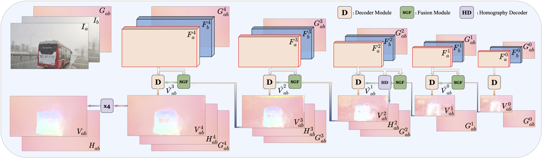 图 4: 给定输入相邻帧Ia,Ib和帧间的陀螺域Gab,编码器会首先以金字塔形式提取不同尺度的图像特征信息,对应的陀螺域也会下采样到对应的尺度。解码器从金字塔的顶端出发,融合陀螺域和图像特征以估计光流和单应性矩阵,并按照“由粗到细”的形式,逐步上采样和优化编码器输出,以得到帧间的光流Vab和单应性矩阵Hab。