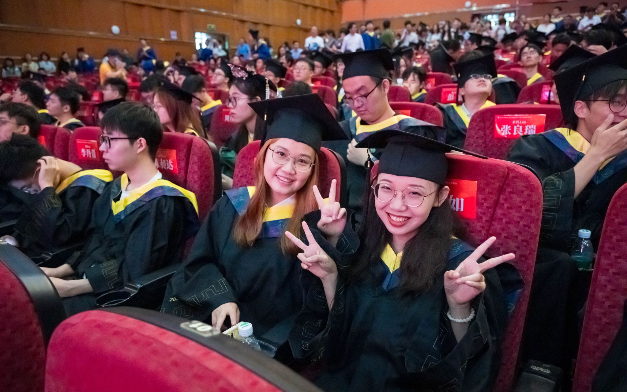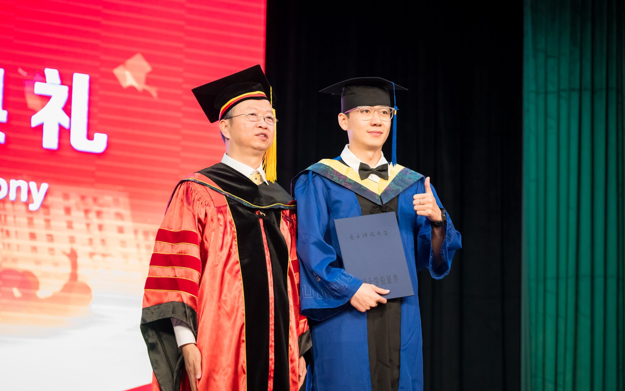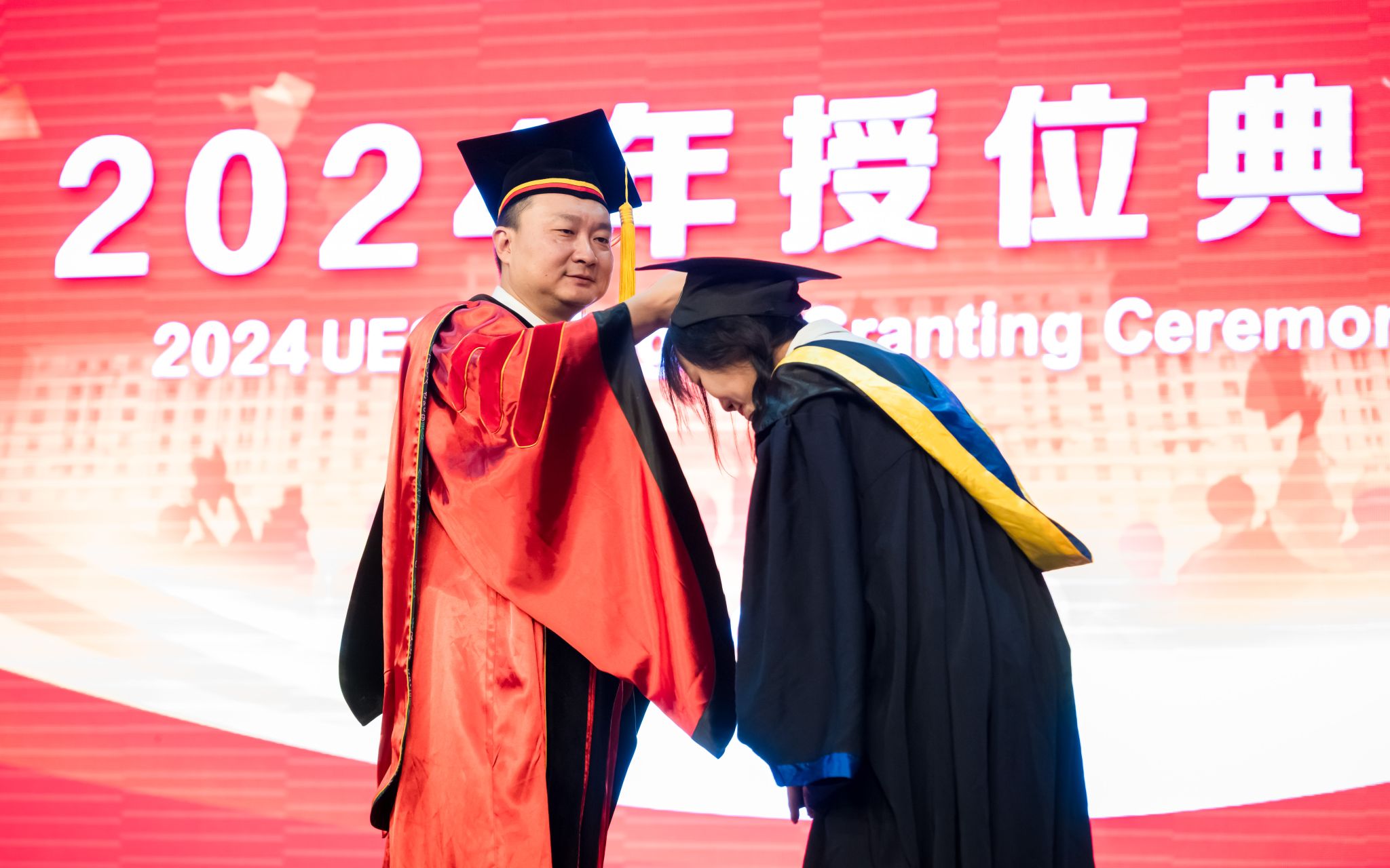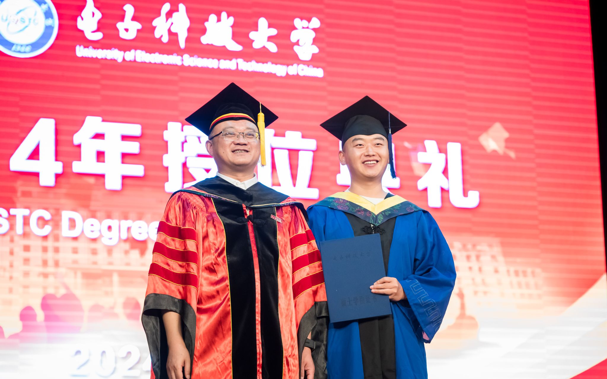 随后,授位典礼正式开始。徐红兵副校长为博士毕业生授位,冷甦鹏书记、黄钰林院长和唐万斌主任为硕士和本科毕业生授位。武俊杰副院长宣读抗干扰实验室和信通学院博士、硕士学位授予名单,虞红芳副院长宣读本科毕业生授位名单。毕业生们依次上台接受学位证书,并与领导、老师合影留念。