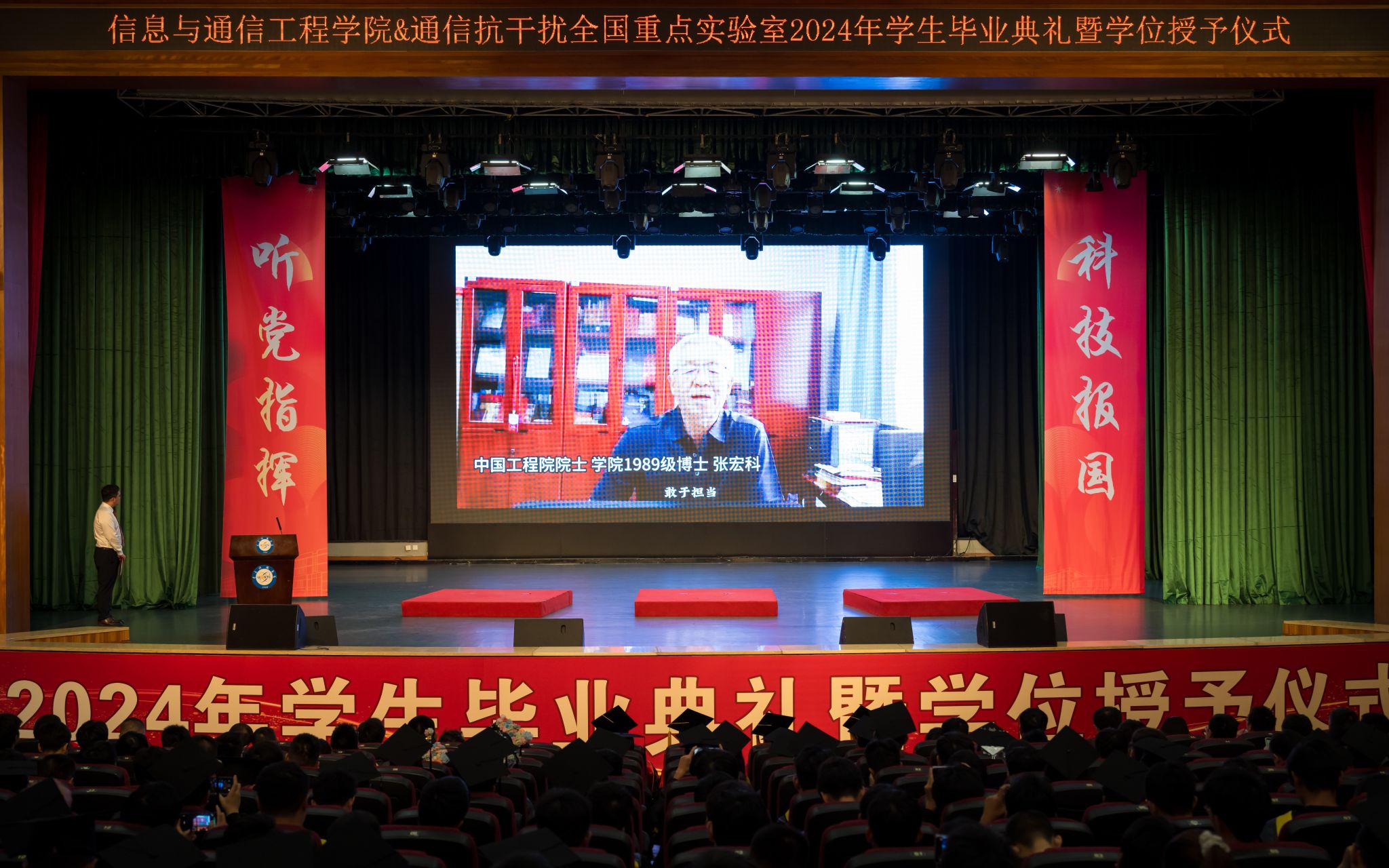 中国工程院院士、学院1989级博士张宏科院士也作为院友代表,通过视频方式为毕业生们送上了寄语。他分享了自己的求学和科研经历,其真挚的话语为在场的同学们带来了极大的鼓舞。相信在他的鼓励下,毕业生们将以优秀院友为榜样,成为心怀“国之大者”新时代好青年。
