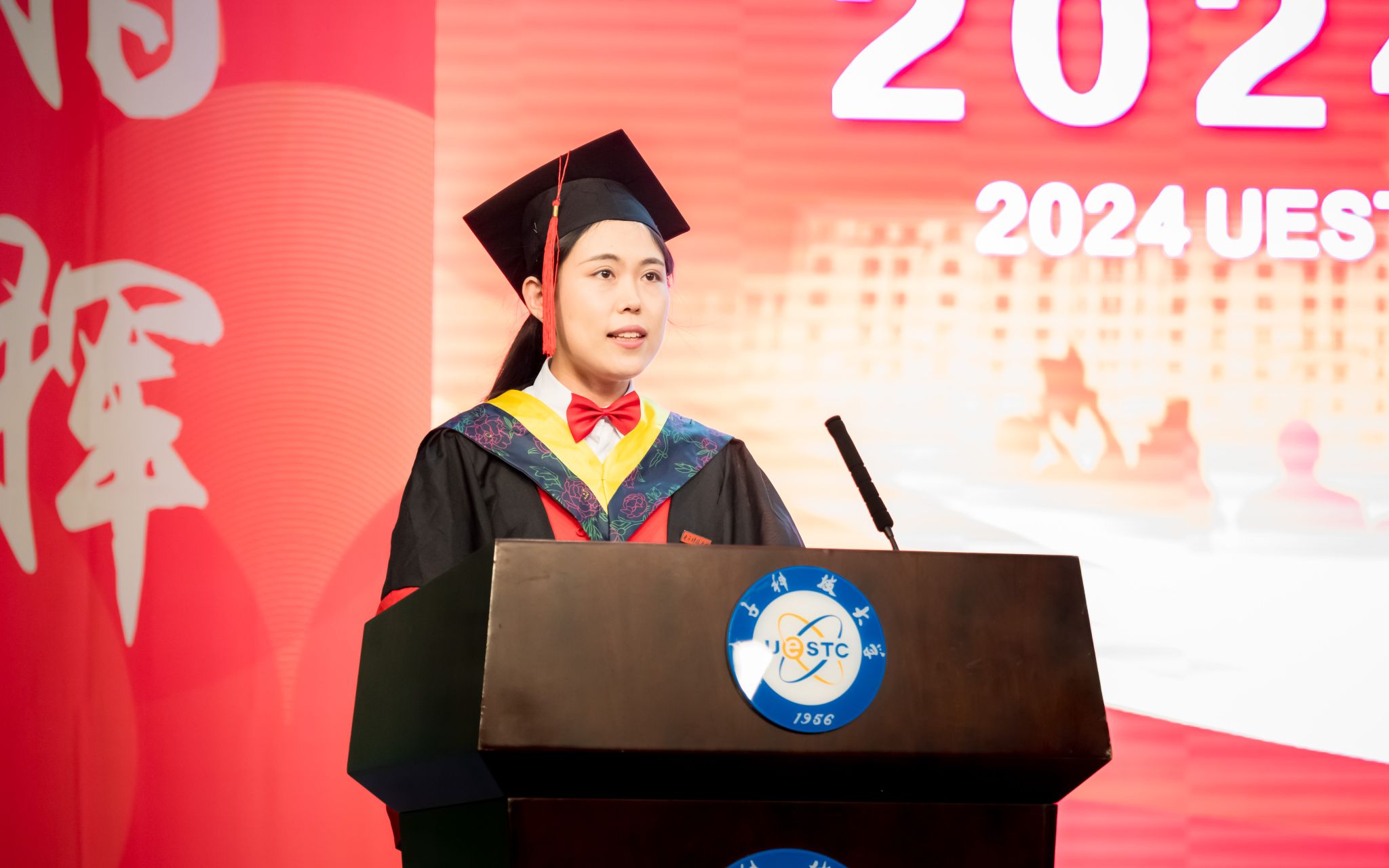 2023年度成电杰出学生、2024届博士研究生王岚晓同学作为毕业生代表发言。她以一名新时代青年学子的视角分享了自己的求学感悟和未来展望。同时强调了团队协作的重要性,希望学弟学妹们在科研的道路上不畏困难、勇往直前,胸怀梦想、为国担当,将个人发展与国家发展紧密结合。
