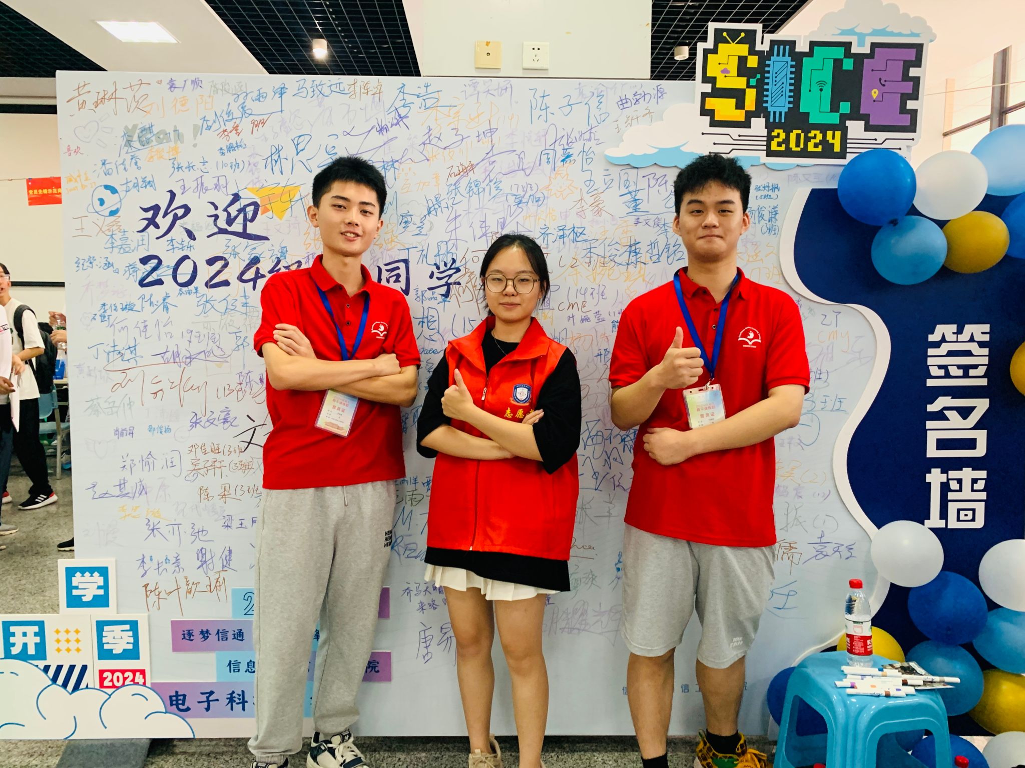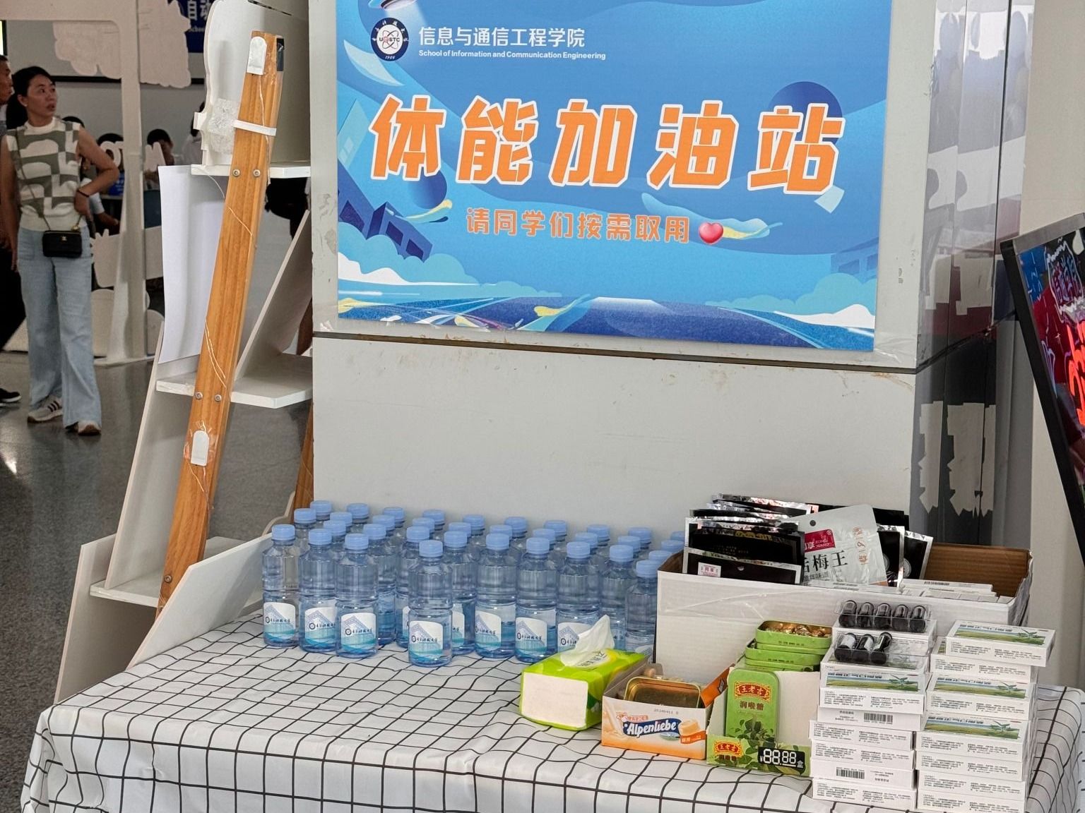 在报到现场,巨大的迎新桁架上由2024级信通新生及其导生的姓名组成“你”字,揭示了信通学子们万众一心、拼搏奋斗的信念,也呼应着听党指挥、科技报国的学科精神。现场还设有新生签名墙以及打卡合影区,承载着2024级新生们对大学的憧憬与梦想。除此之外,现场还设置了暖心的体能加油站,为大家准备了矿泉水、小零食、藿香正气水和纸巾等物资,为迎新工作持续充电。