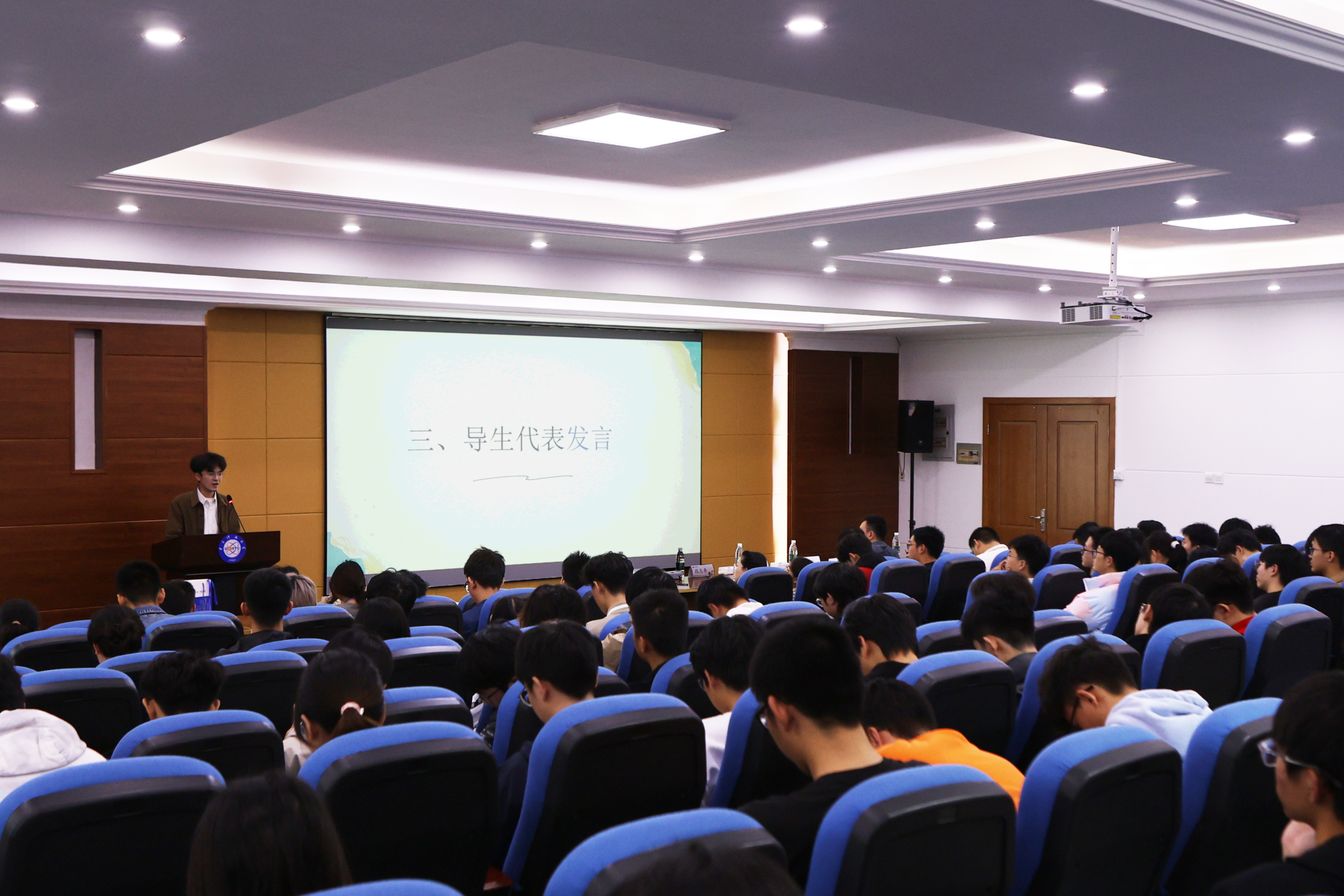 随后,现场播放了精心制作的导生DV集锦。各班级通过视频的形式,回忆了导生与同学们相处的点点滴滴,清晰的画面唤醒内心的记忆,温馨的场景表达真挚的情感,大家深为感动。在导生发言环节,11班导生汪上策谈到,导生的身份让他获得了锻炼成长,自己也得以将曾受到的正面影响传递下去。他呼吁各位导生继续发挥传帮带作用,做到“不止当一个班的导生,更要做全年级的导生;不只是一年的导生,更要做一直的导生。”9班导生张坤鹏说道,以导生的身份再次度过大一的学习时光是很奇妙的经历,很高兴自己能见证大家在专业学习、科研竞赛、学生工作和实践志愿等方面的尝试与进步,祝福大家带着期待勇往直前,在未来遇见更好的自己。