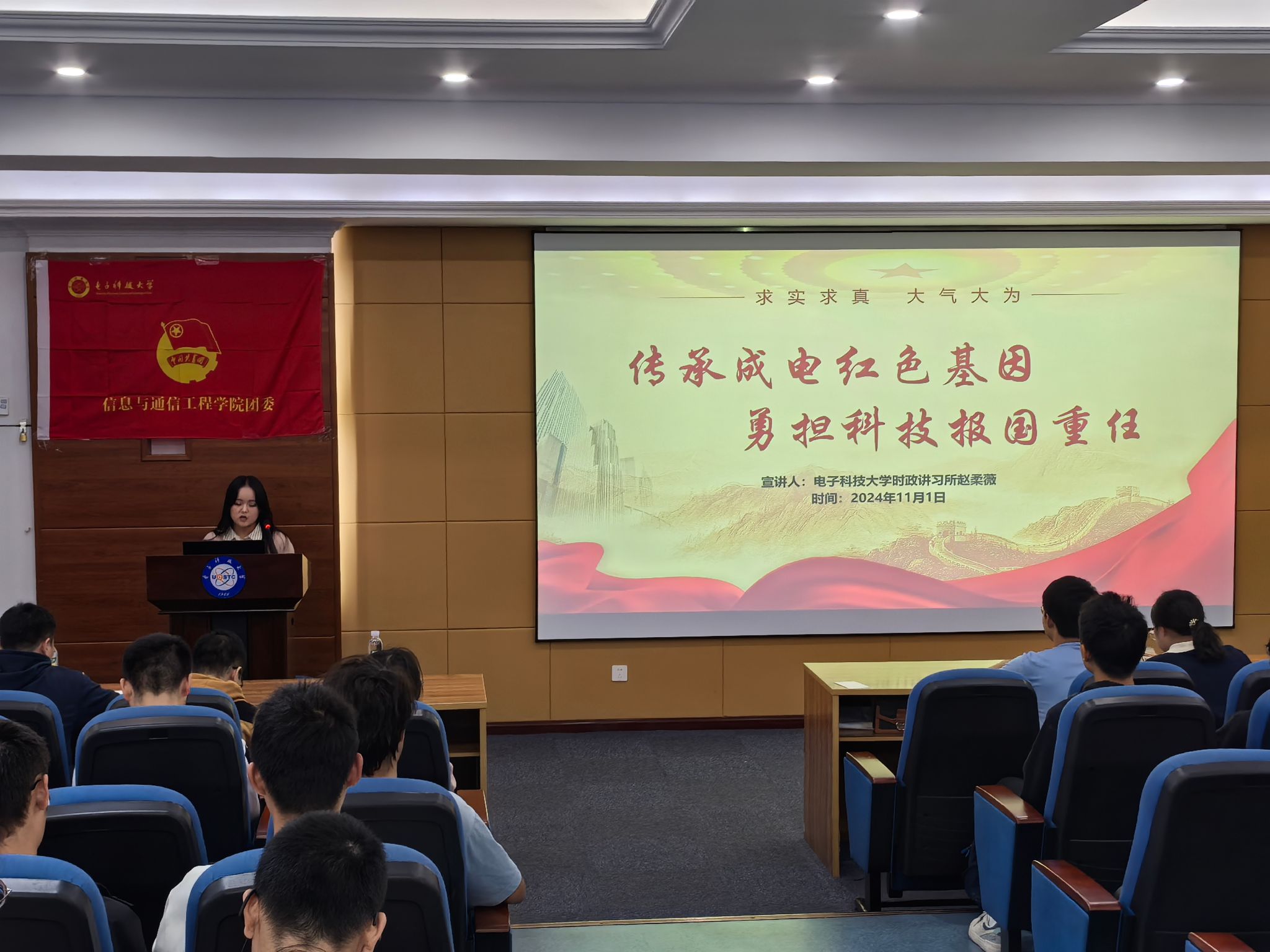 在整齐嘹亮的团歌声中,主题团日活动拉开帷幕。首先,马克思主义学院时政讲习所宣讲员赵柔薇作题为《传承成电红色基因,勇担科技报国重任》的主题宣讲。赵柔薇结合党的二十届三中全会精神,向大家介绍了《中共中央关于进一步全面深化改革 推进中国式现代化的决定》的主要内容。她通过一段影片介绍了众多老一辈科技工作者冲破重重阻碍,回到祖国怀抱的经历。优秀科学家们将投身科研攻关,促进科技发展作为价值追求与人生信念,他们的光荣事迹启发了同学们对科技报国的思考。