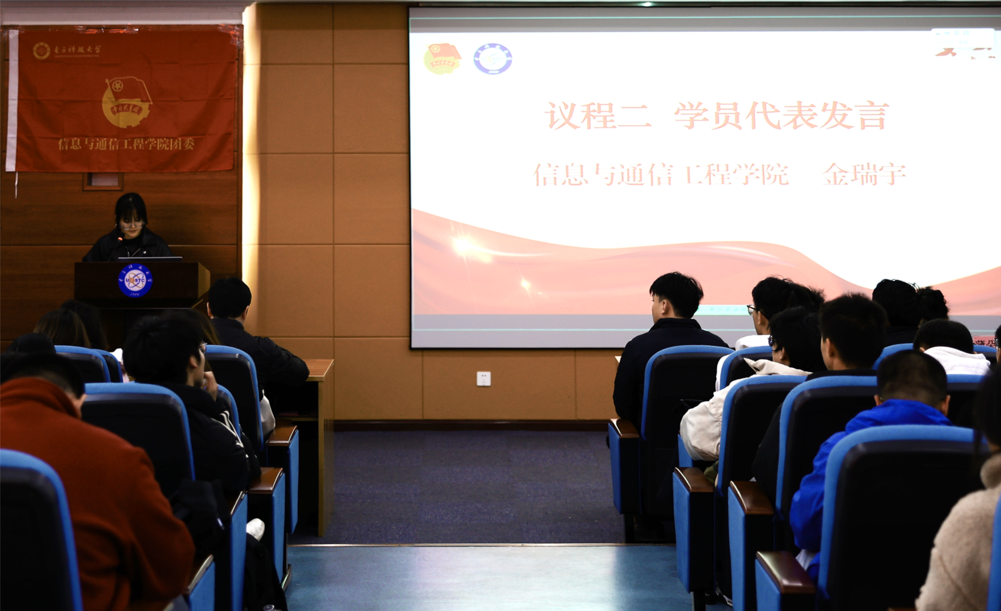 在嘹亮的国歌声中,结业仪式拉开帷幕。首先,信通学院2023级本科生金瑞宇作为学员代表发言。她仔细回顾了团校每次理论学习和主题实践的内容,并分享自己的心得体会,认为团校不仅是对党团创新理论和方针政策的又一次深入学习,也让大家更加坚定了为党的事业奋斗终身的决心。她呼吁大家携手共进,努力成长为有理想、敢担当、能吃苦、肯奋斗的新时代好青年。