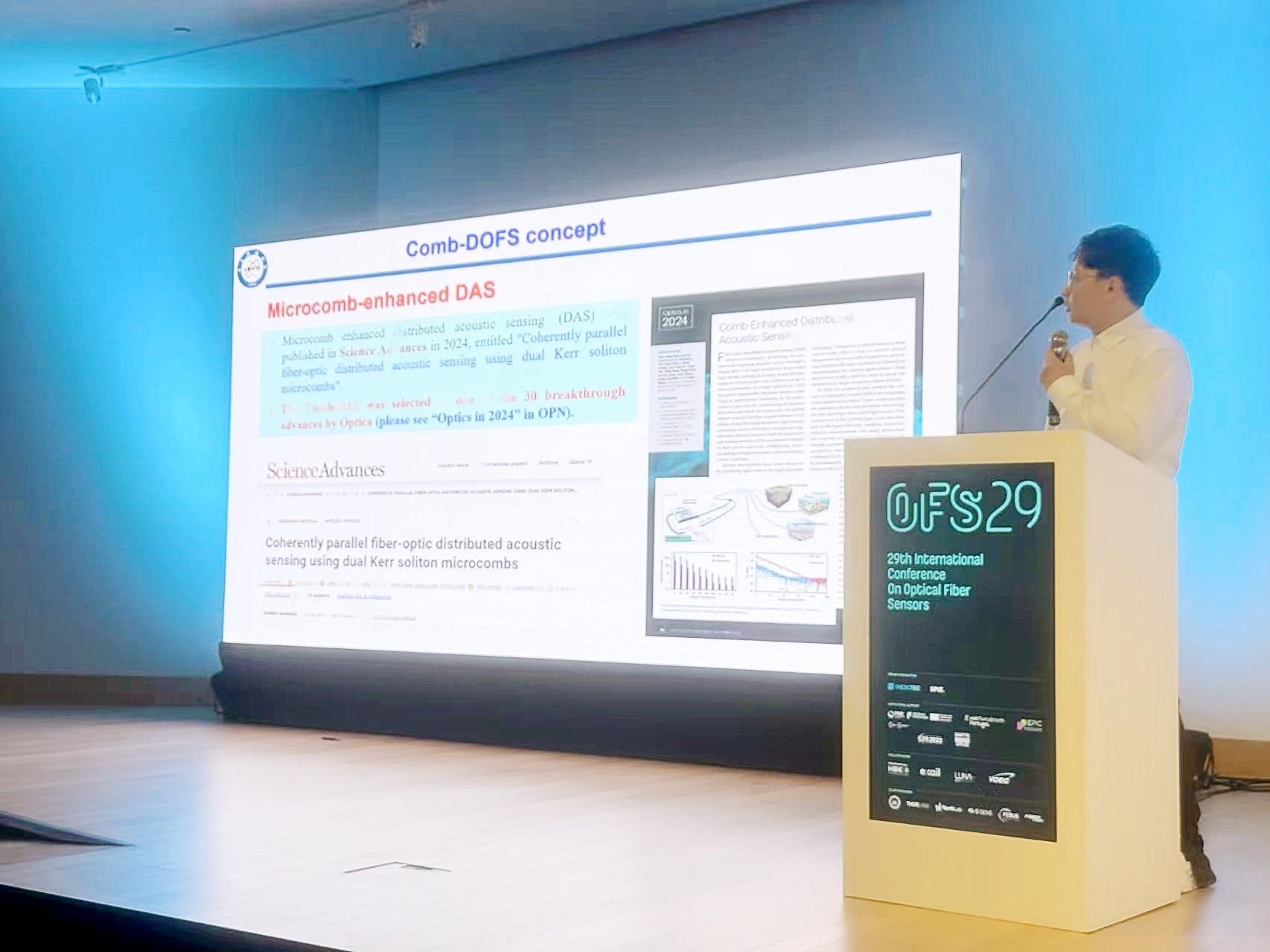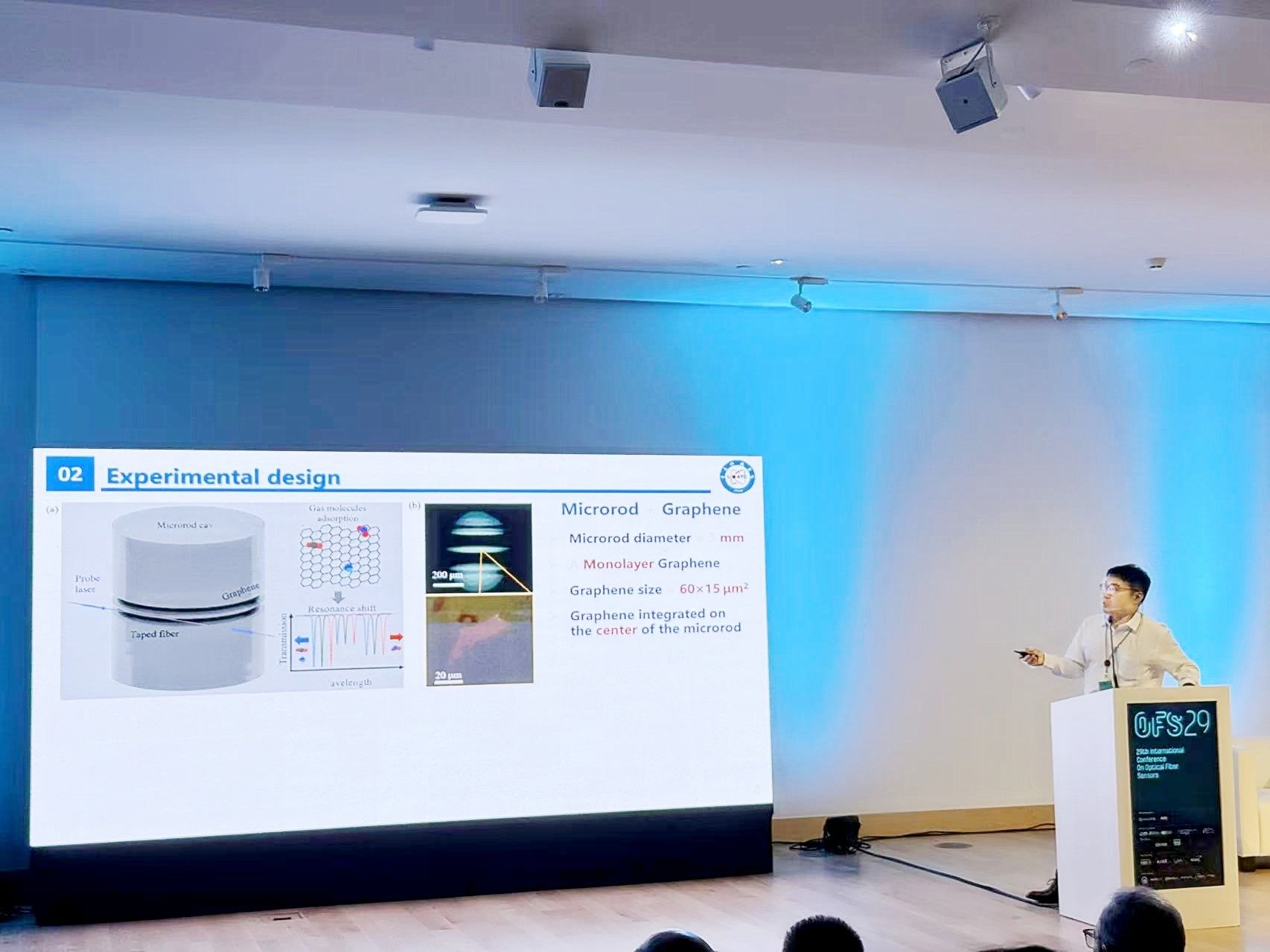 博士生黎建廷做了题为“Microcomb-enhanced BOTDR”的大会口头报告,首次将微腔光频梳应用于布里渊光时域反射仪BOTDR,显著提升了其信噪比和传感距离,是分布式光纤传感技术的一个突破;博士生唐荣做了题为“Novel sensing network based on seamless integration of DAS and PON”的大会口头报告,提出了一种基于现有无源光网络的新型光纤通感无缝融合架构,具有重要应用价值;博士生王雨晨做了题为“Ultra-sensitive gas detection using noise-canceled graphene-microcavity-based fiber laser sensor”的大会口头报告,基于共模噪声抑制机理,实现了一种基于石墨烯DBR光纤微腔的超灵敏气体传感器;博士生张浩做了题为“A graphene micro-rod resonator gas sensor with switchable selectivity”的大会口头报告,提出了一种基于石墨烯-微杆的具有可切换选择性的新型气体传感器,具有独创性。四个报告均得到了与会代表的好评。其中,博士生张浩的论文荣获OFS29最佳学生论文奖(大会共4篇)。