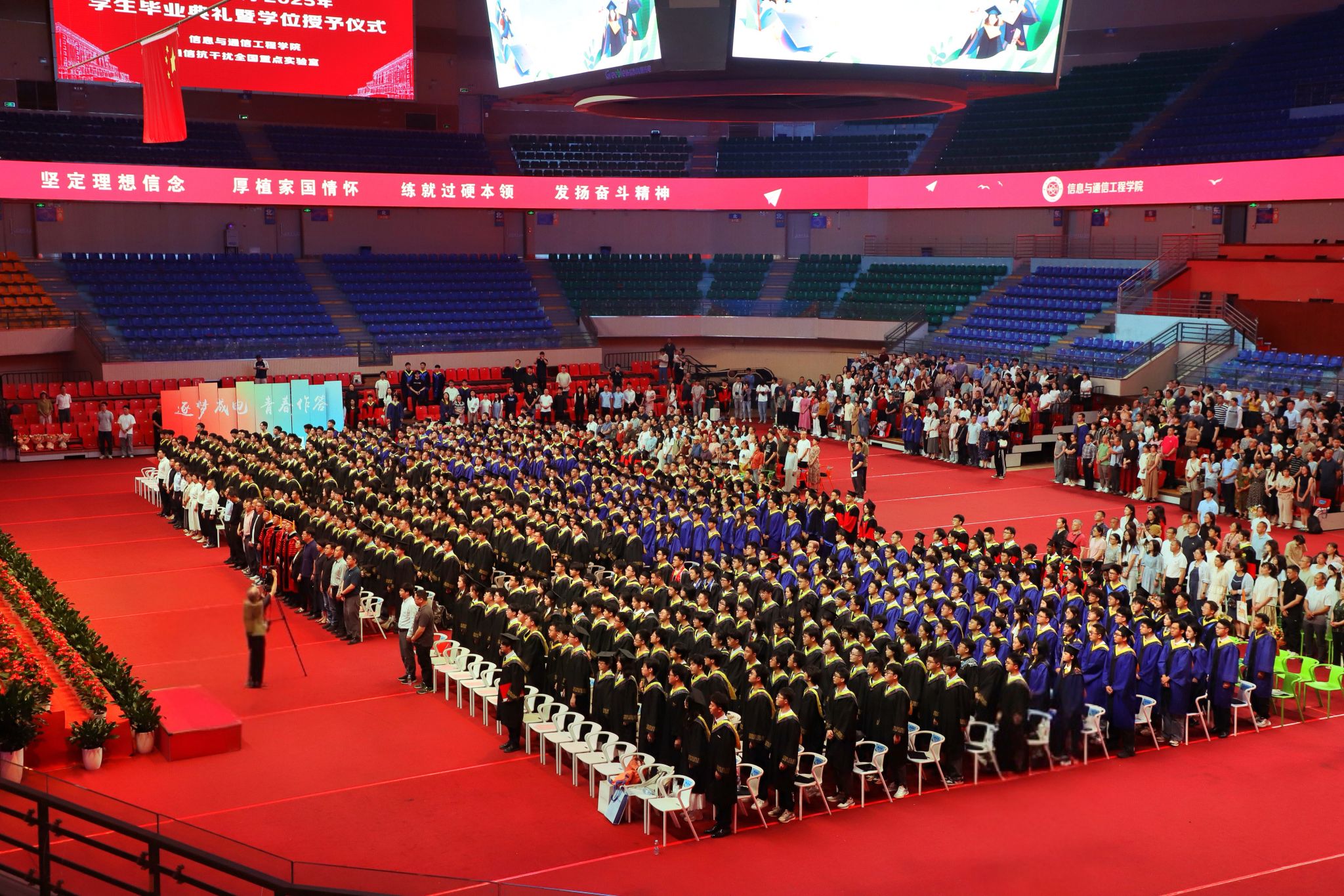 典礼正式开始,全场嘉宾肃立,进行毕业典礼致敬环节。老师们、家长们以热烈的掌声向毕业生们表示热烈祝贺,毕业生们向老师们、家长们、朋友们鞠躬致敬,感谢他们的陪伴与支持。致敬环节后,全场齐声高唱中华人民共和国国歌。