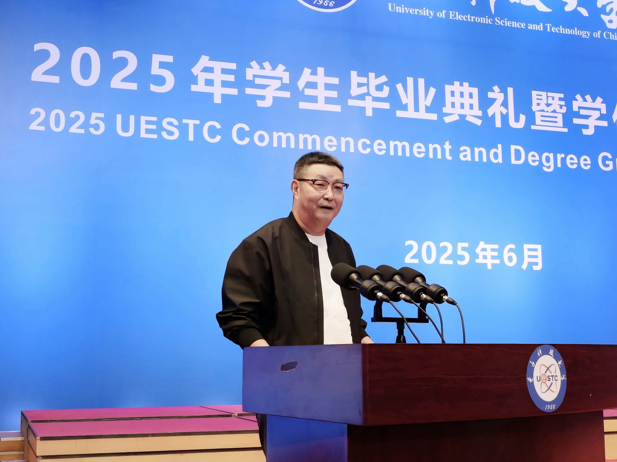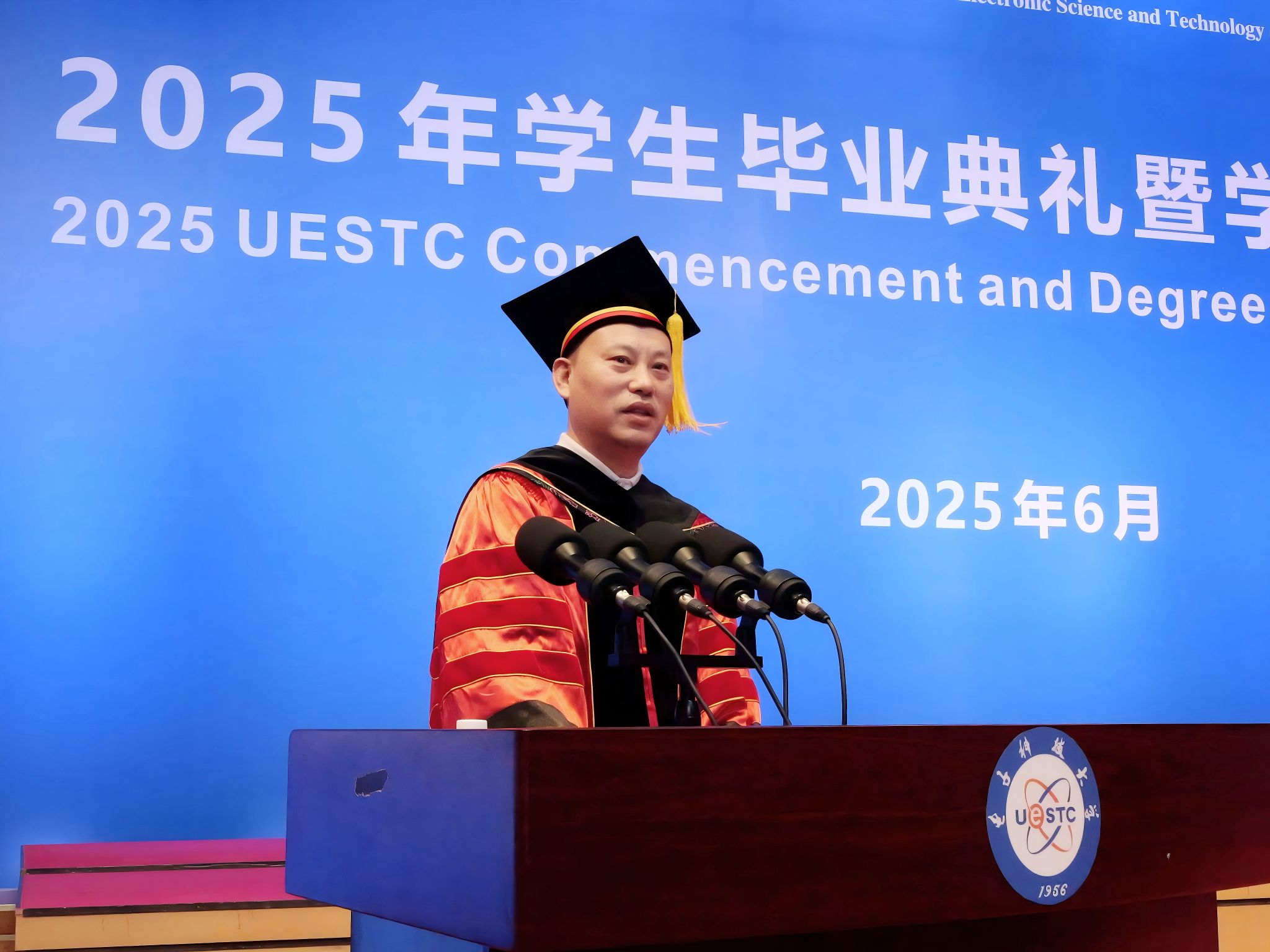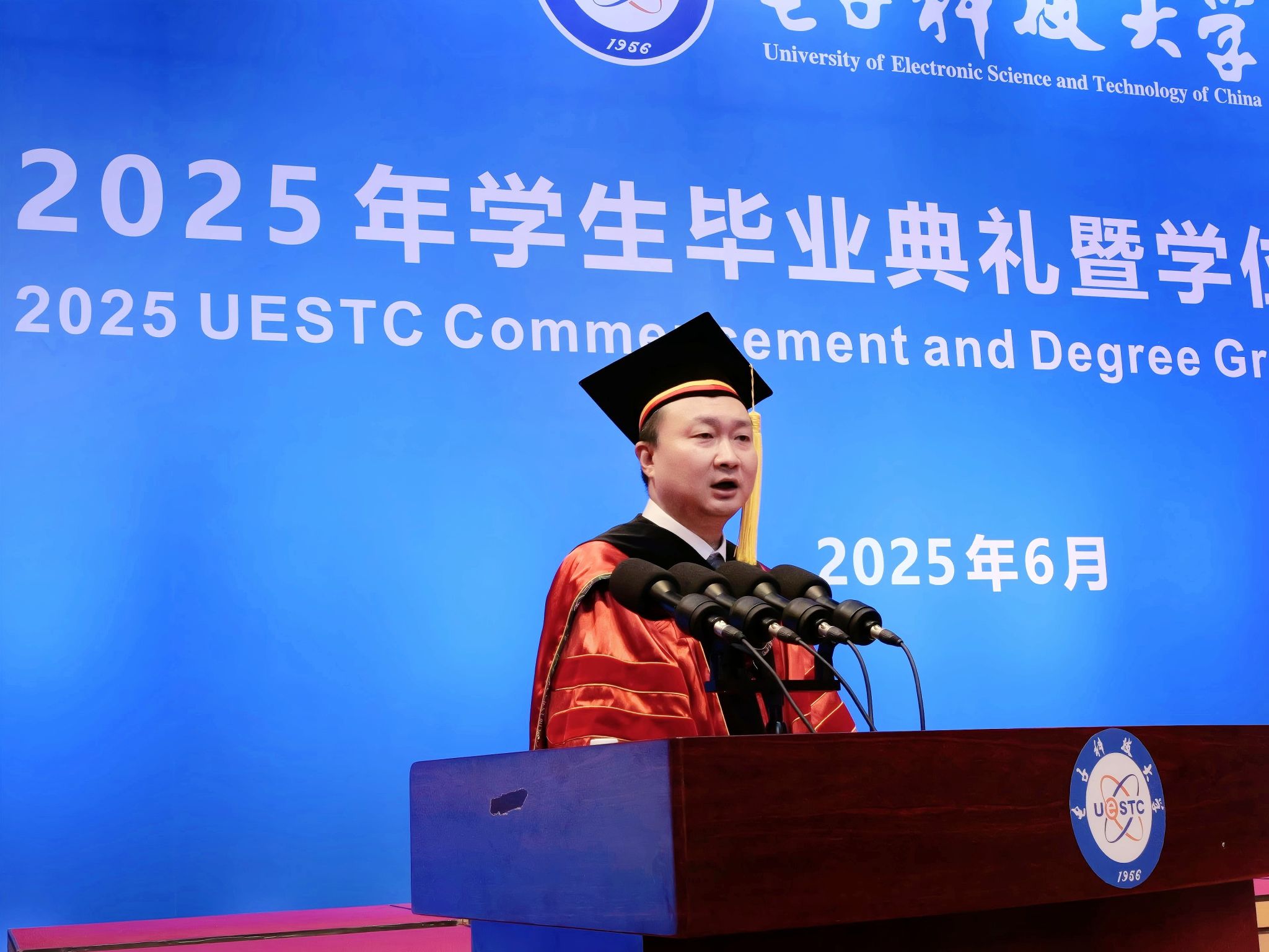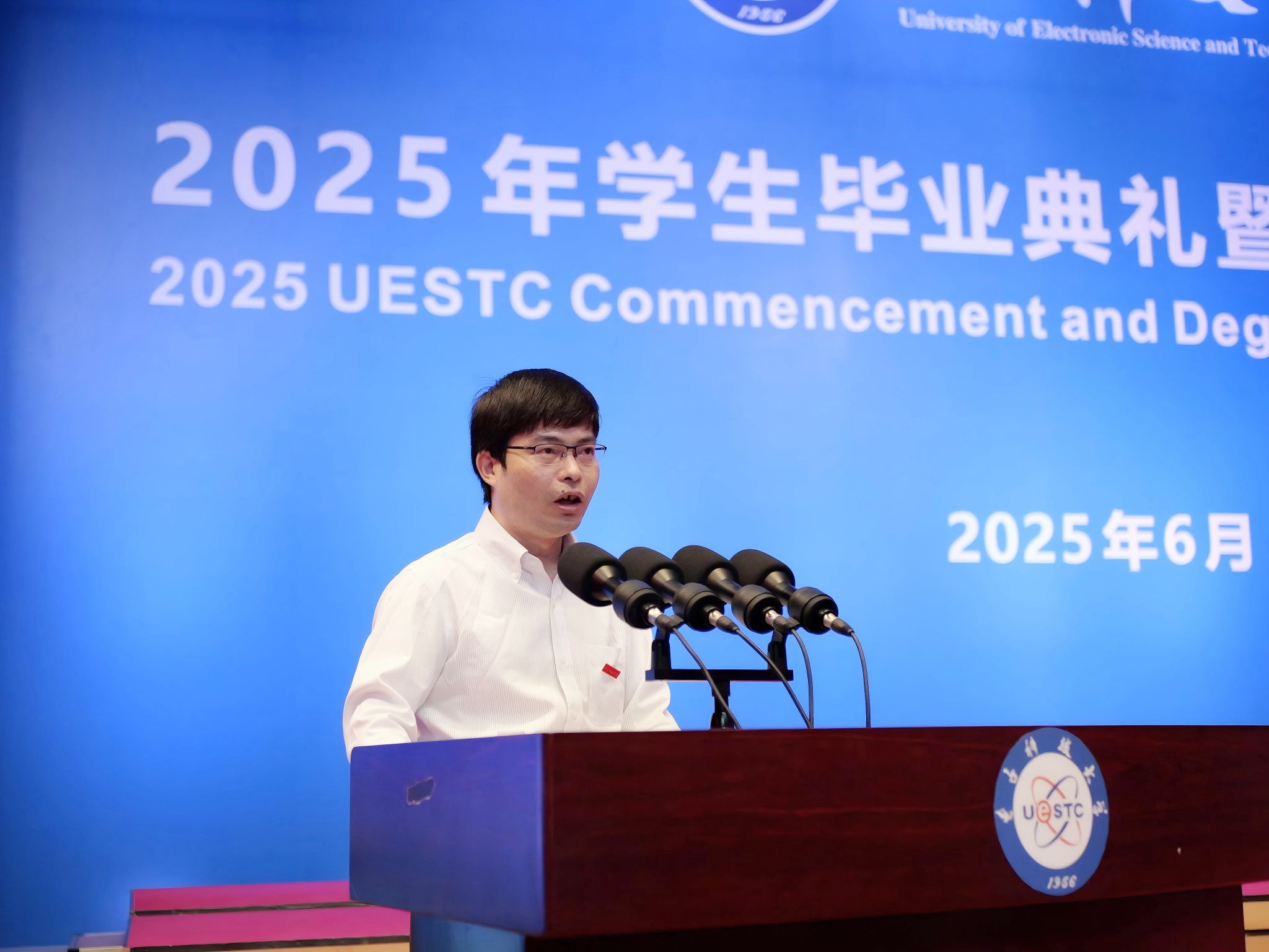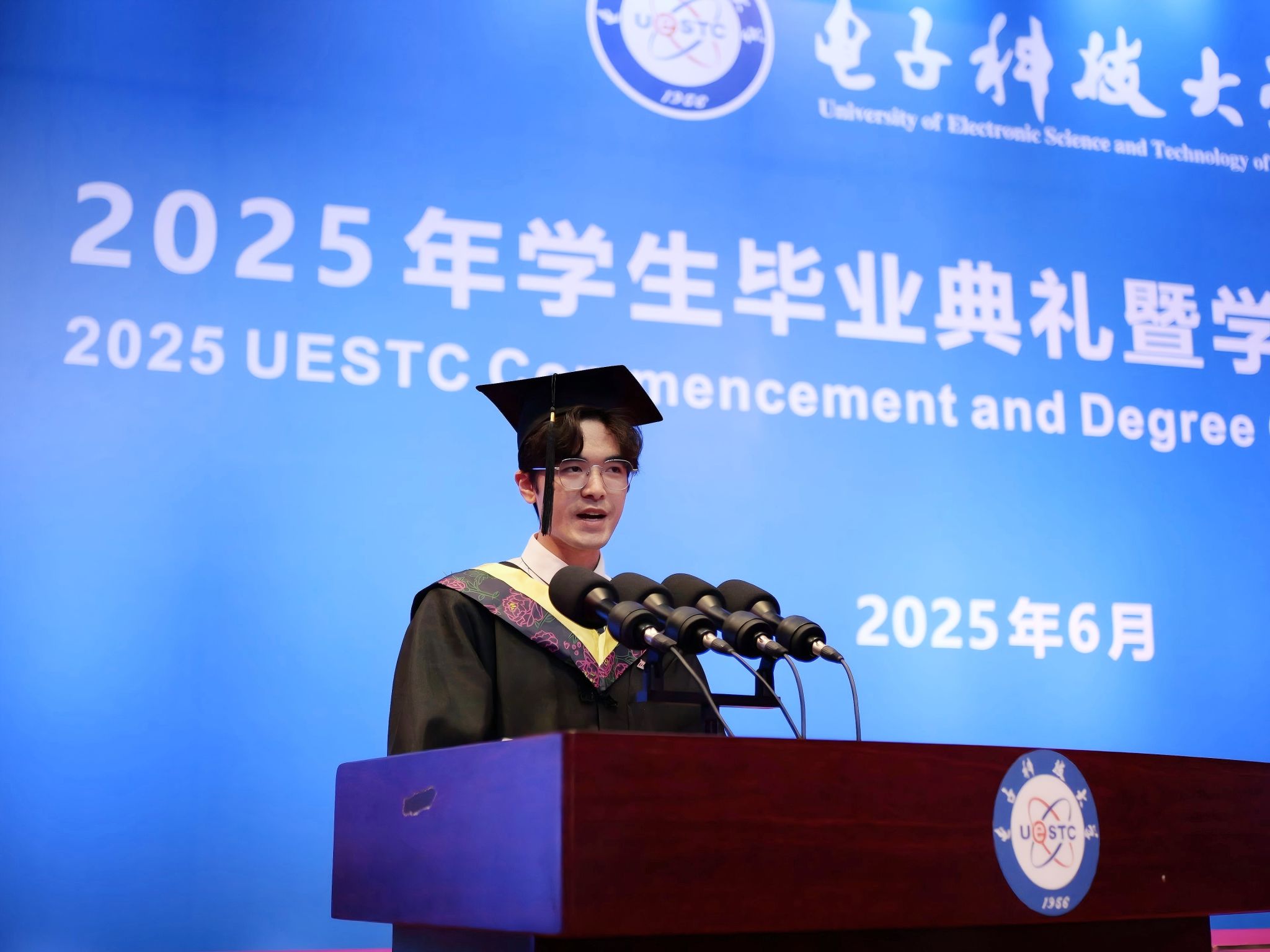 2025届本科毕业生汪上策作为毕业生代表发言,他用“突破、选择、感恩”三个关键词回顾了大学四年的蜕变历程,呼吁毕业生们牢记“求实求真,大气大为”的成电精神,在未来的时代浪潮中乘风破浪,谱写无愧于时代的青春华章。