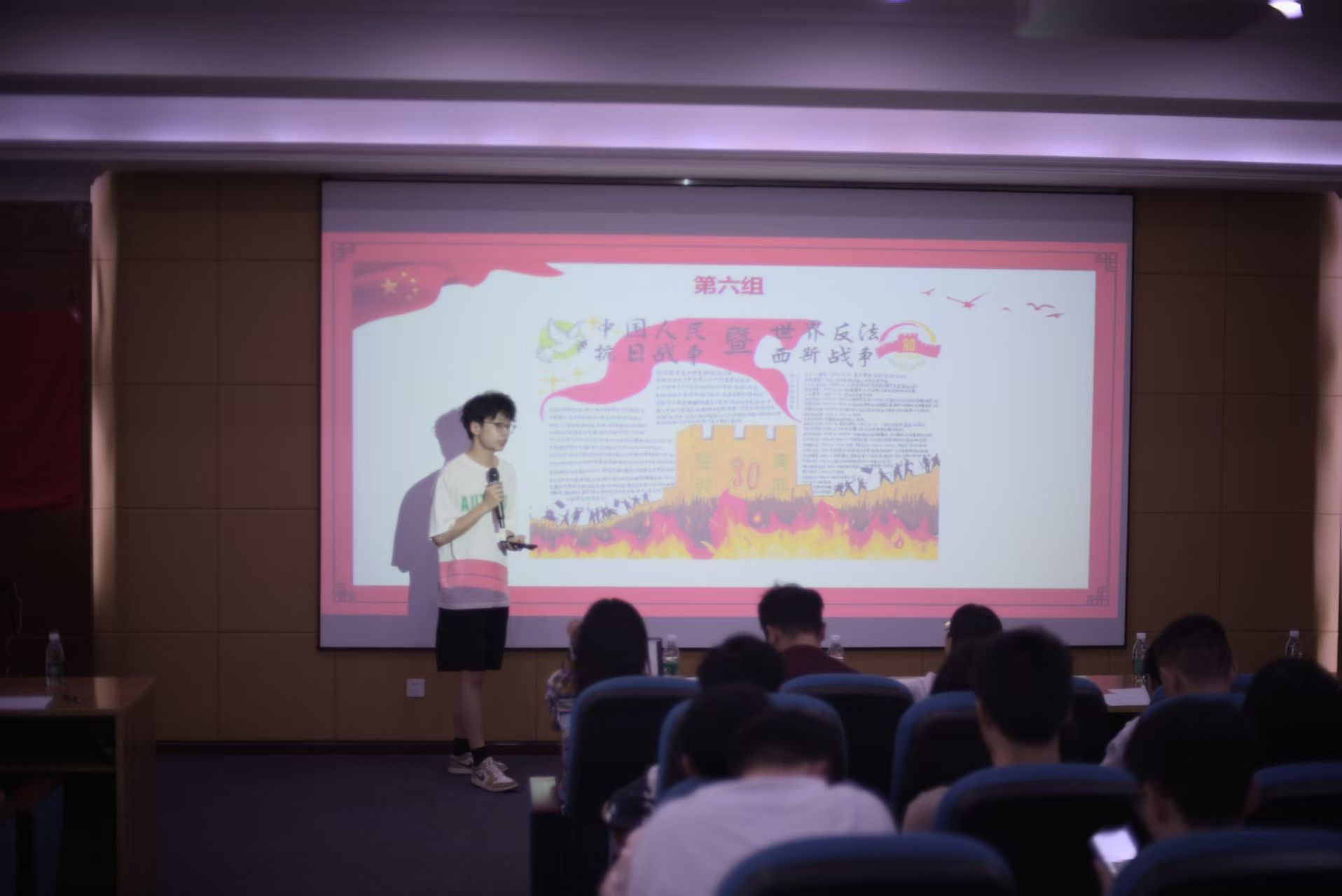 活动伊始,10个小组的发言代表在台上展示精心绘制的手抄报,阐述创作立意,用文字和绘画纪念世界反法西斯战争暨中国人民抗日战争胜利80周年,表达对中国共产党光辉历史的理解。