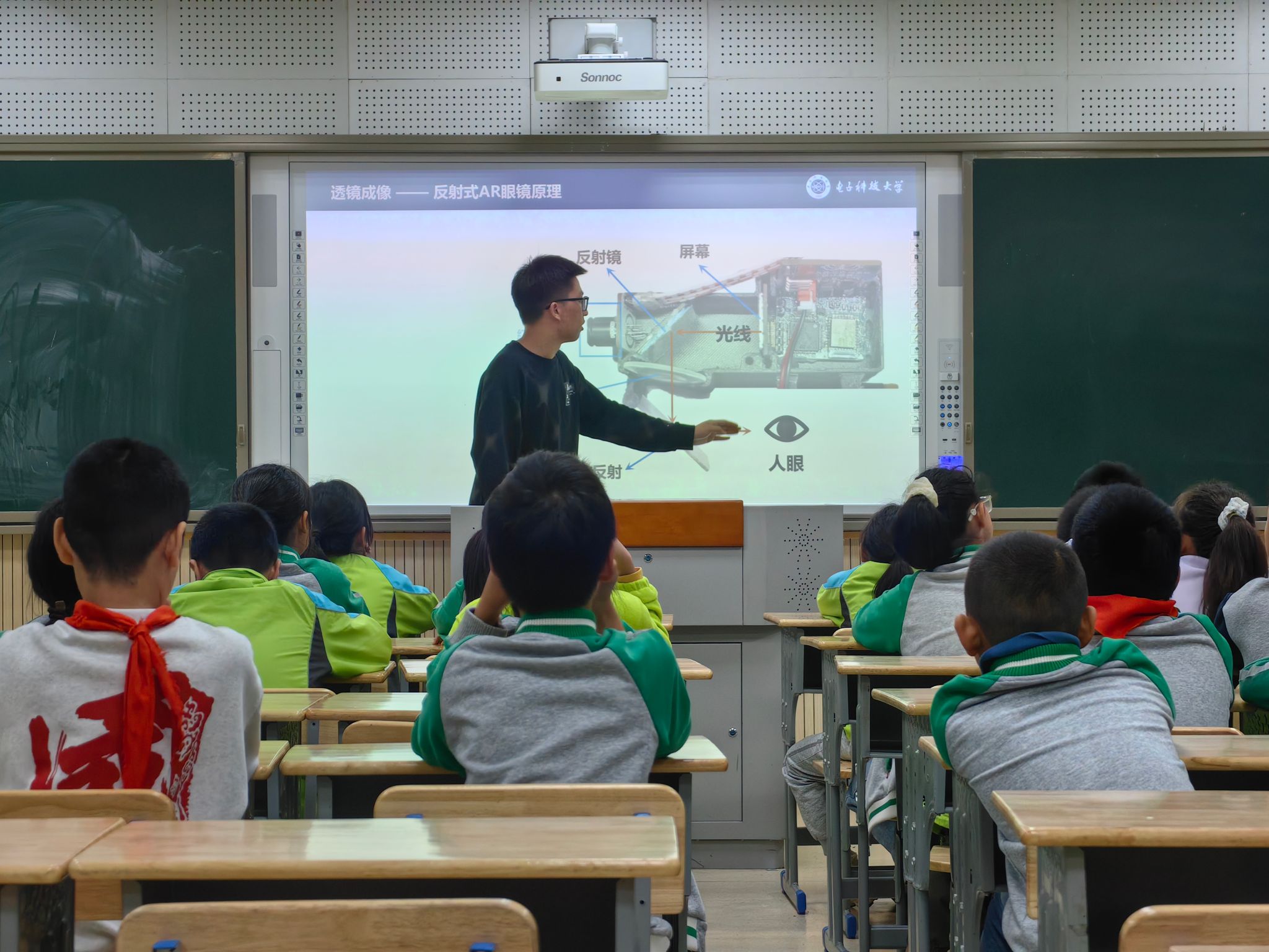 “大家仔细听,声音是不是只在特定区域才能清晰听到?” 伴随着清脆提问,学院科协成员董亦凡带来科创作品 “超声波音响”,在孩子们好奇的注视下,拉开了科普课堂的帷幕。毛青山同学则带领同学们体验热成像AR 眼镜,在实地体验中感受科技魅力。