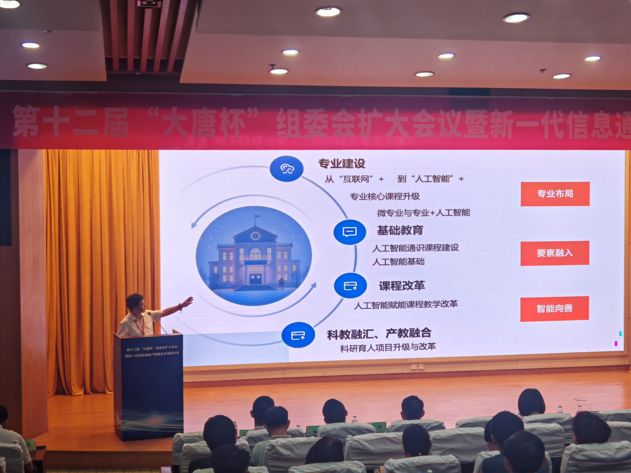 7月13日,段景山老师在武汉“新一代信息通信产教融合交流研讨会”上,以“AI 专业教育+产教融汇双赋能,培育新时代电子信息类数智人才”为题,向全国高校及企业代表介绍学院 AI 融入教学各环节的实践经验;8月22日,其又在郑州“数智赋能 协创未来,全国高校电子信息类教学改革论坛”作专题报告,进一步推广学院电子信息类专业与课程建设成果。