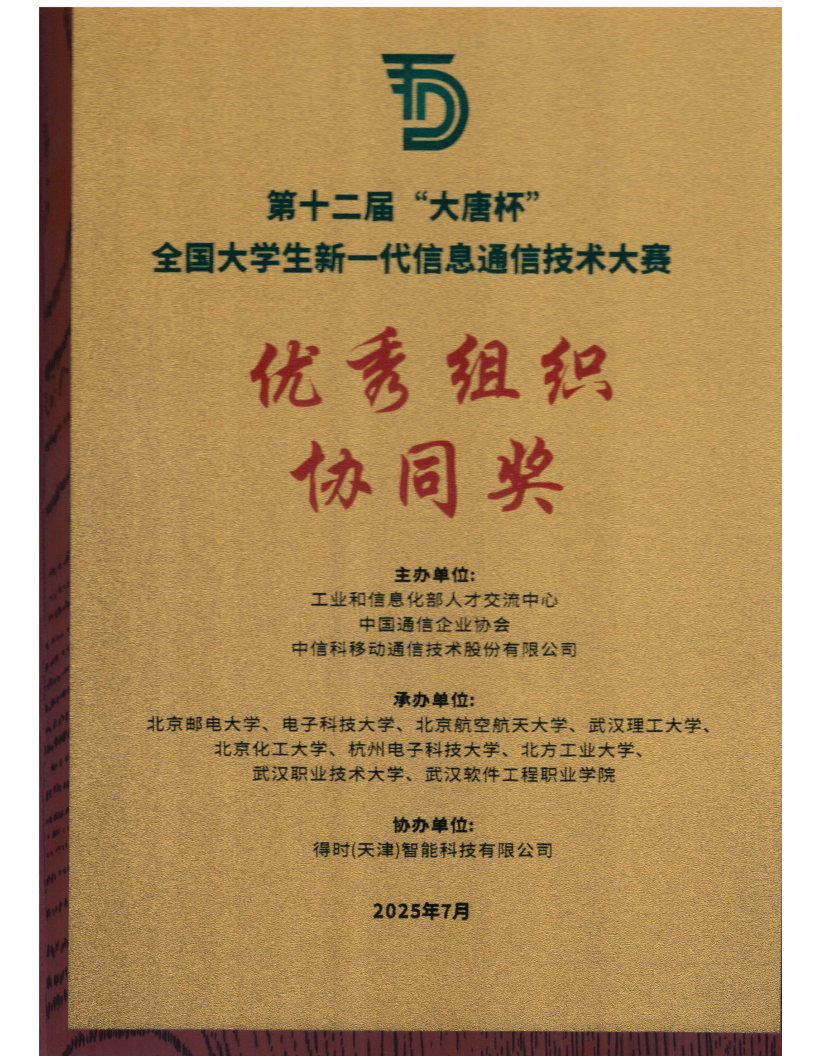 学院“大唐杯”大赛教练组从年初组织报名开始,备赛、开展省赛及国赛的比赛训练等工作,历时半年共组织全校260余人,110支队伍参赛,获得赛方颁发的“优秀组织协同奖”。