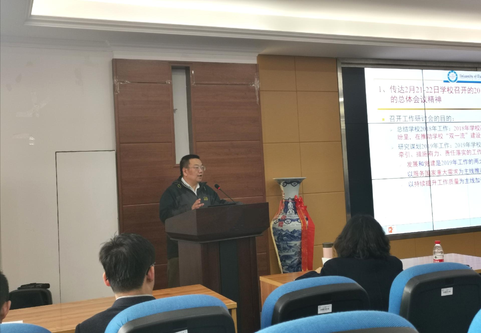 党委书记李玉柏在会上传达了学校2019年工作研讨会会议精神,介绍了学院党建和思政工作、人才工作安排,要求学院教师要强化政治引领,树牢“四个意识”,在思想上要有高度的政治敏感性,紧密围绕学校的发展重点和战略布局开展学院的各项核心工作,共同为学院的快速发展贡献力量。
