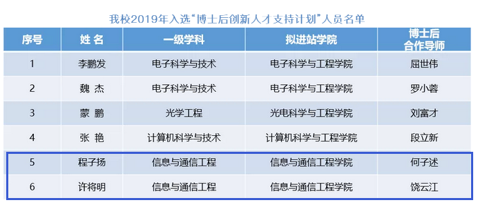 近日,全国博士后管委会办公室公布了2019年度“博士后创新人才支持计划”资助人选名单,来自全国98个单位、60个学科的400名博士入选。我院程子扬、许将明2人入选。