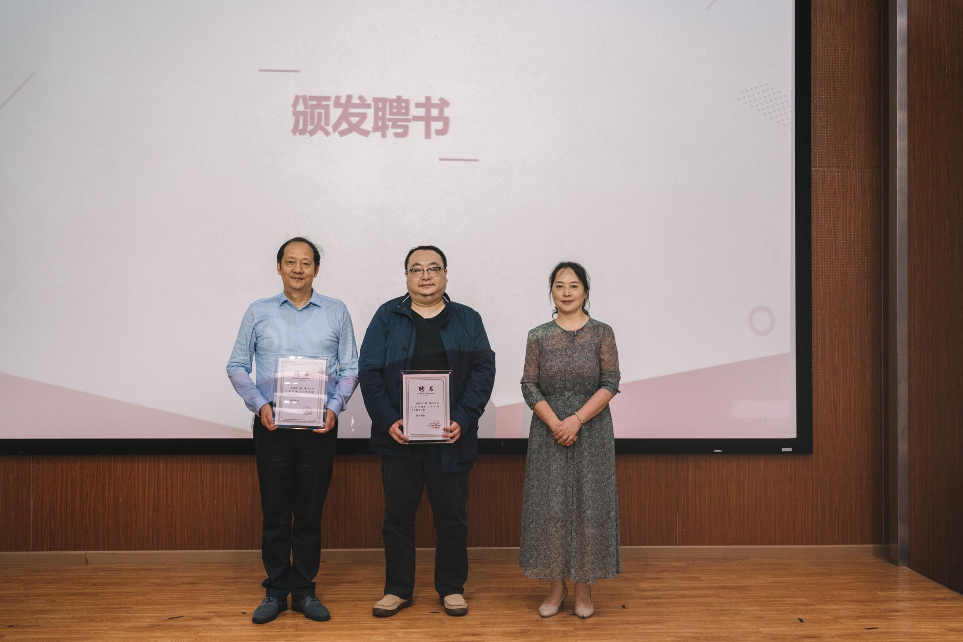 访谈会开始前,张琼为邵昱和李冉两位嘉宾颁发学院校外导师聘书,并与众嘉宾一起合影留念。