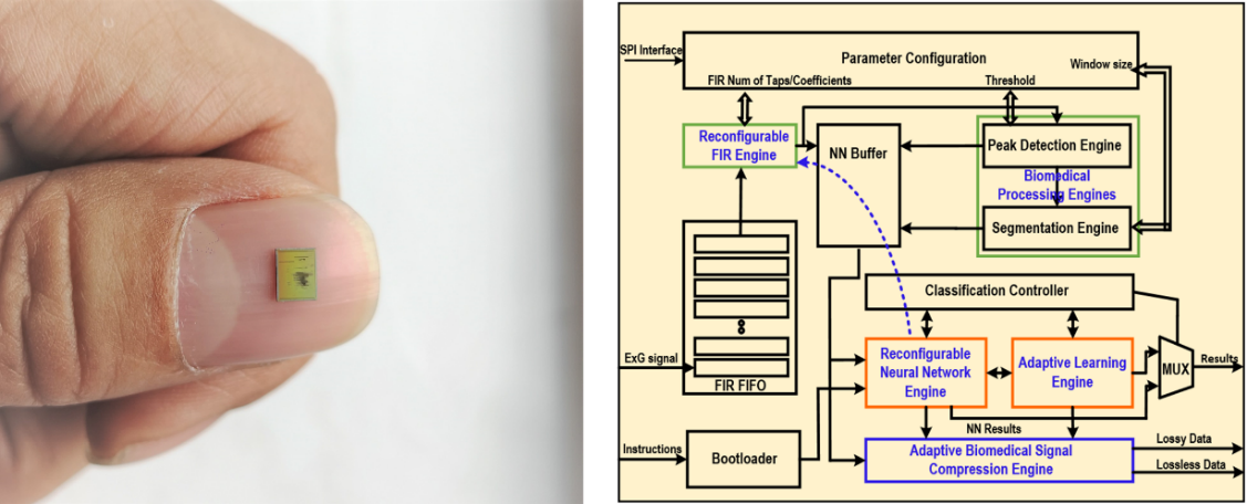 未来可穿戴/植入式智能健康监测设备的一个核心模块是生理信号AI处理芯片。一方面,现有的通用AI处理芯片功耗一般在毫瓦级别,不适合超低功耗可穿戴/植入式健康监测。另一方面,已有的生理信号AI处理芯片只能支持单一的AI健康监测任务(如心电识别、癫痫检测、运动感知、情绪监测等)。此外,生理信号可能存在较大的病人间差异性(Patient-to-Patient Variation),在实际应用中,预先训练好的生理信号AI分类算法可能对某些病人的识别准确率会大幅下降。为解决以上挑战,周军教授团队研发了一种超低功耗、可重构、支持自适应学习的生理信号AI处理芯片(名为BioAIP)。在该芯片中,研究人员设计了具有硬件重构能力的神经网络处理引擎,可以完成不同的神经网络结构计算,从而支持不同的生理信号AI处理算法。同时,设计了多种可灵活配置的生理信号处理引擎,如可配置滤波模块、峰值检测模块、信号分窗模块等,从而支持不同的生理信号预处理任务。二者相互结合,可用于多种不同的AI健康监测应用。在此基础上,还提出并实现了一系列超低功耗芯片设计技术,如事件驱动神经网络处理架构,片上数据近似压缩技术、神经网络/预处理引擎复用技术、自适应生理信号压缩技术等。在心电识别、癫痫检测、运动感知等多个AI健康监测任务中,达到了小于6微焦的极低分类能耗。另外,该研究针对生理信号病人间差异性,提出了一种低复杂度自适应学习技术,使得AI算法可以学习不同病人的生理信号特征,从而大幅提升准确率,又不增加太多功耗。该AI处理芯片可以用于多种可穿戴/植入式智能健康监测设备,具有广阔的应用前景。