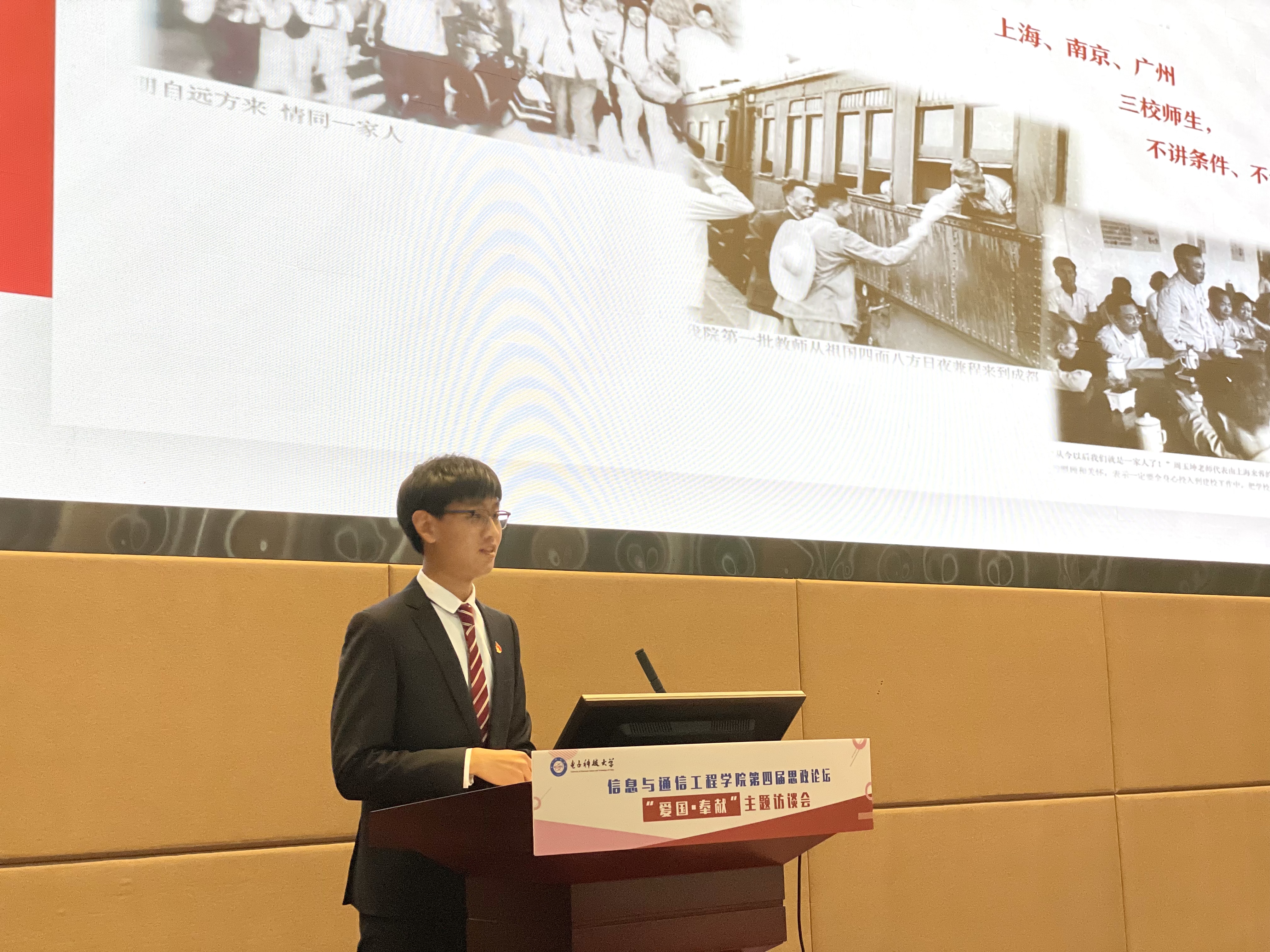赵苇航作为学生代表,以“爱国志愿行 奉献新时代”为题分享自己关于“爱国 奉献”的理解与践行。他从老一辈成电人献身国防事业、为祖国培养电子信息人才的坚定信仰讲起,同时结合自身专业学习和志愿服务经历,表示要影响和带领更多的人践行志愿精神,发扬奉献情怀,承担社会责任,投身科研攻关,展现成电学子大气大为的担当。