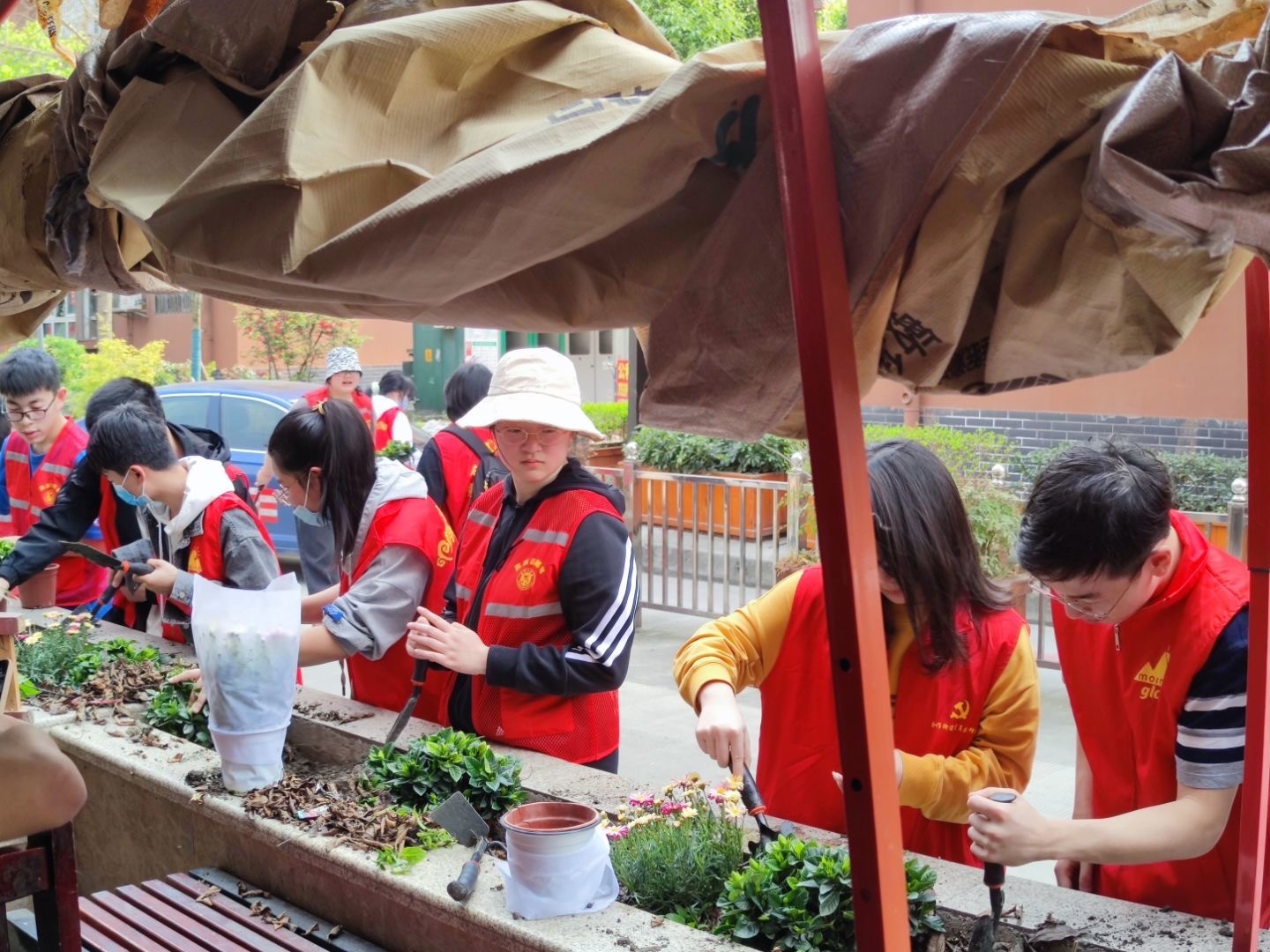 植树节活动在社区阿姨的细心指导下有条不紊的开展,分配栀子花树、领取铲子,锄头等植树工具,每组人员到相应的植树花盆处开始种植。同学们认真学习,耐心种植。铲士填坑、挥锹培土、夯实土层、浇水灌根.....大家有序分工,拎水的,挖坑的,扛树苗的,浇水的,来回穿梭,井井有条。在大家齐心协力,短短三个小时时间,就种了100颗栀子花树树苗。最后,大家看着自己的劳动成果:一颗颗栀子花树挺拔而立时,脸上都心满意足的露出了笑容。而从大家热情洋溢的笑脸就可以看看出大家为环保事业尽自己的绵薄之力之后的那难以掩饰的幸福感。从而也让这个植树节变成一个充满爱心与成就感的植树节。