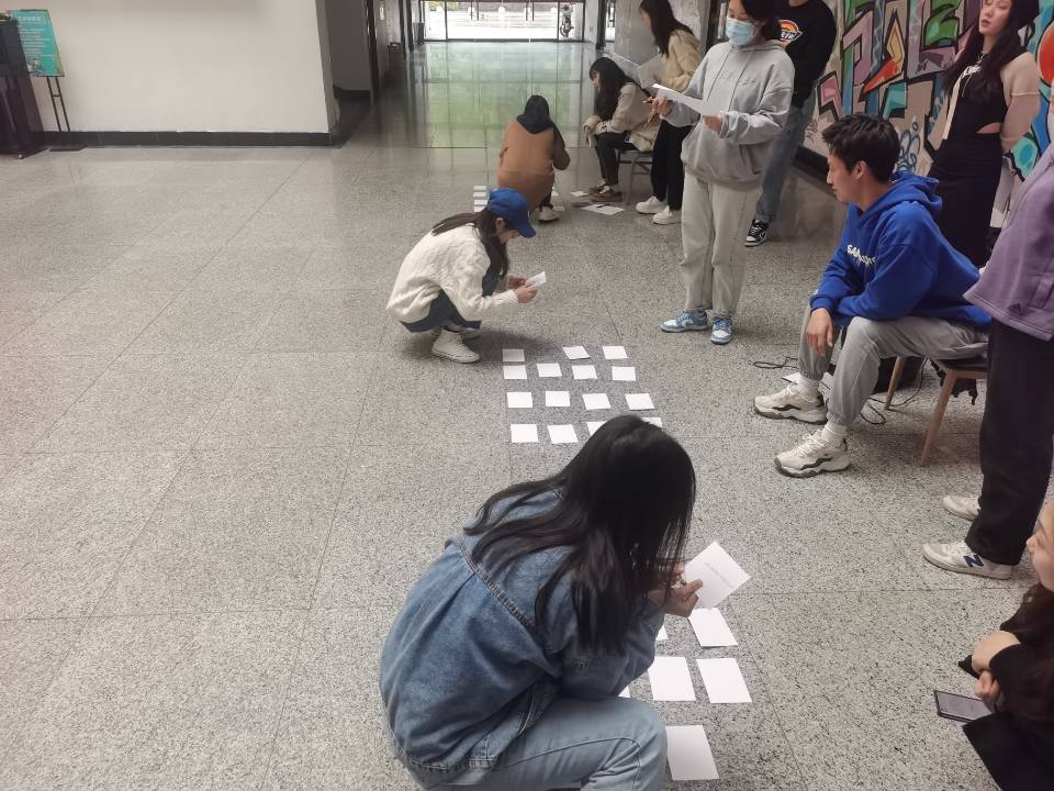 随后进行的是本次活动的热点环节——“党史速度码牌”。设置两处置卡点分别摆放党史题目和相应题目的卡片,随机打乱。各组从起点线出发依次前往两处置卡点翻卡片,每人每次翻看一张题目卡片后盖回原处,由另外一人选择一张答案卡片进行匹配。本环节的题目源于学习强国平台,在考察同志们日常学习情况的同时,对其党史知识进行扩充与巩固。面对不确定的干扰项,同志们沉着思考,冷静分析,相互进行激烈的讨论,学习热情高涨。