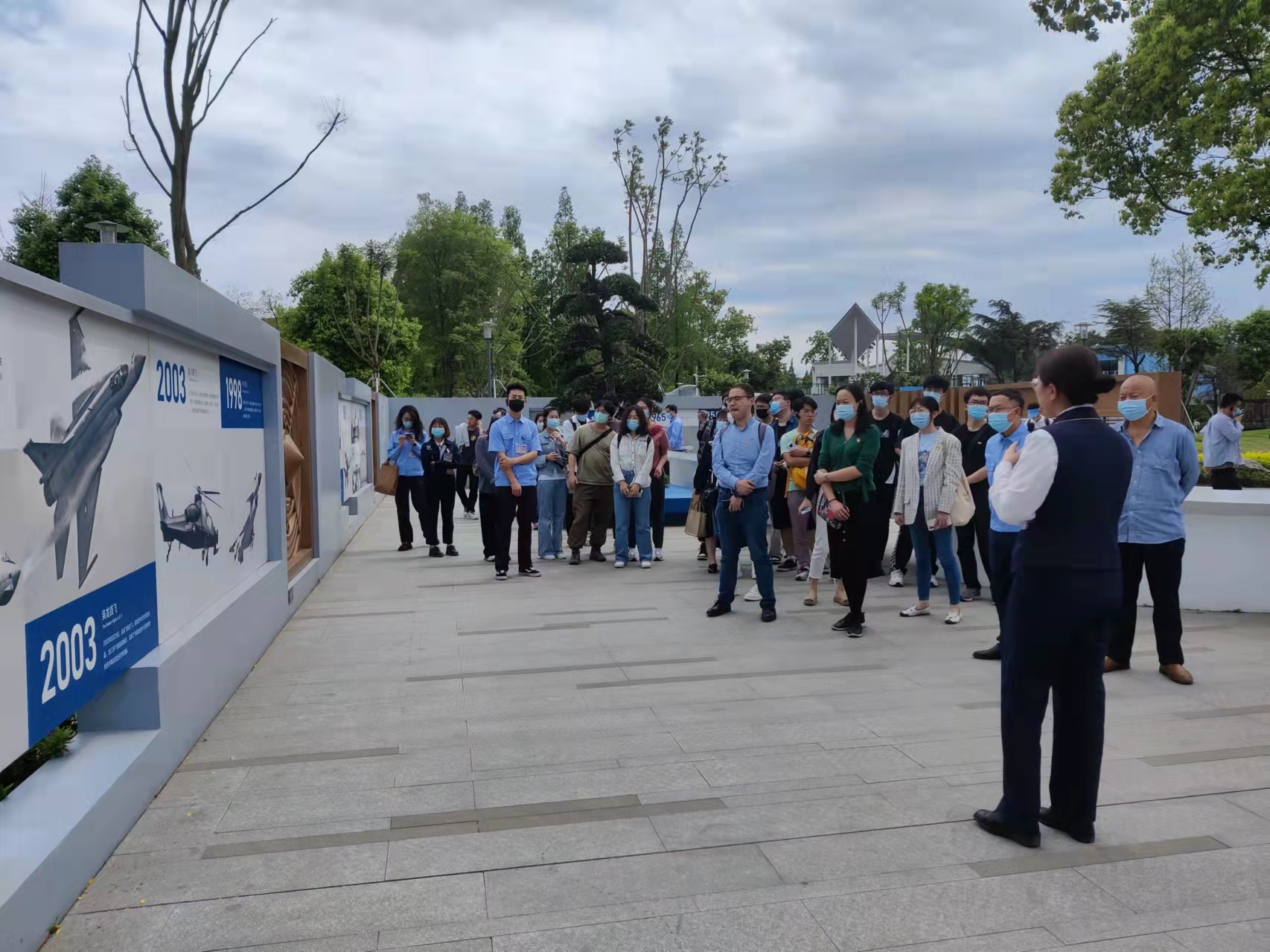 师生们首先来到成飞公园,在讲解员的带领下,大家从威龙广场出发,一路穿过航空史迹、铁翼风华、龙腾广场、航空问道、三滴油广场、航空拾趣等区域,学习了世界航空发展史和战斗机发展史。展陈板上的一张张老照片记录着中国航空从无到有、从弱到强的伟大征程,在场师生无不感叹于祖国航空工业的辉煌成就。