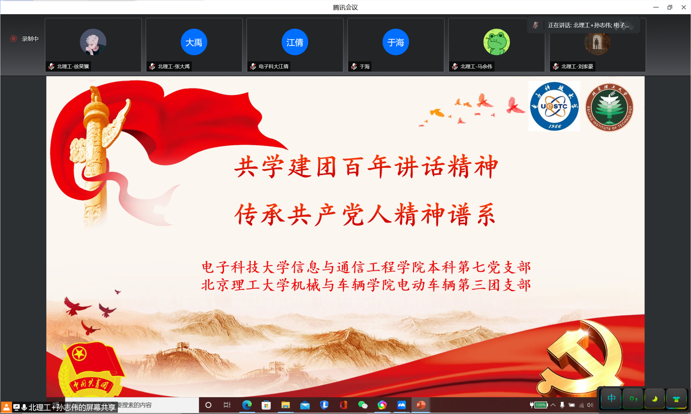 5月24日,william英国中文本科第七党支部与北京理工大学机械与车辆学院电动车辆第三团支部举行“共学建团百年讲话精神,传承共产党人精神谱系”党团联学共建活动。北理工机车学院团委书记郝佳馨、副书记魏瑶,信通学院学生科科长江倩、辅导员徐展参加活动。williamhill官网信通学院与北京理工大学机车学院均为全国党建工作标杆院系,本次活动采用线上线下结合的方式,由北理工机车学院电车三团支书孙志伟主持。