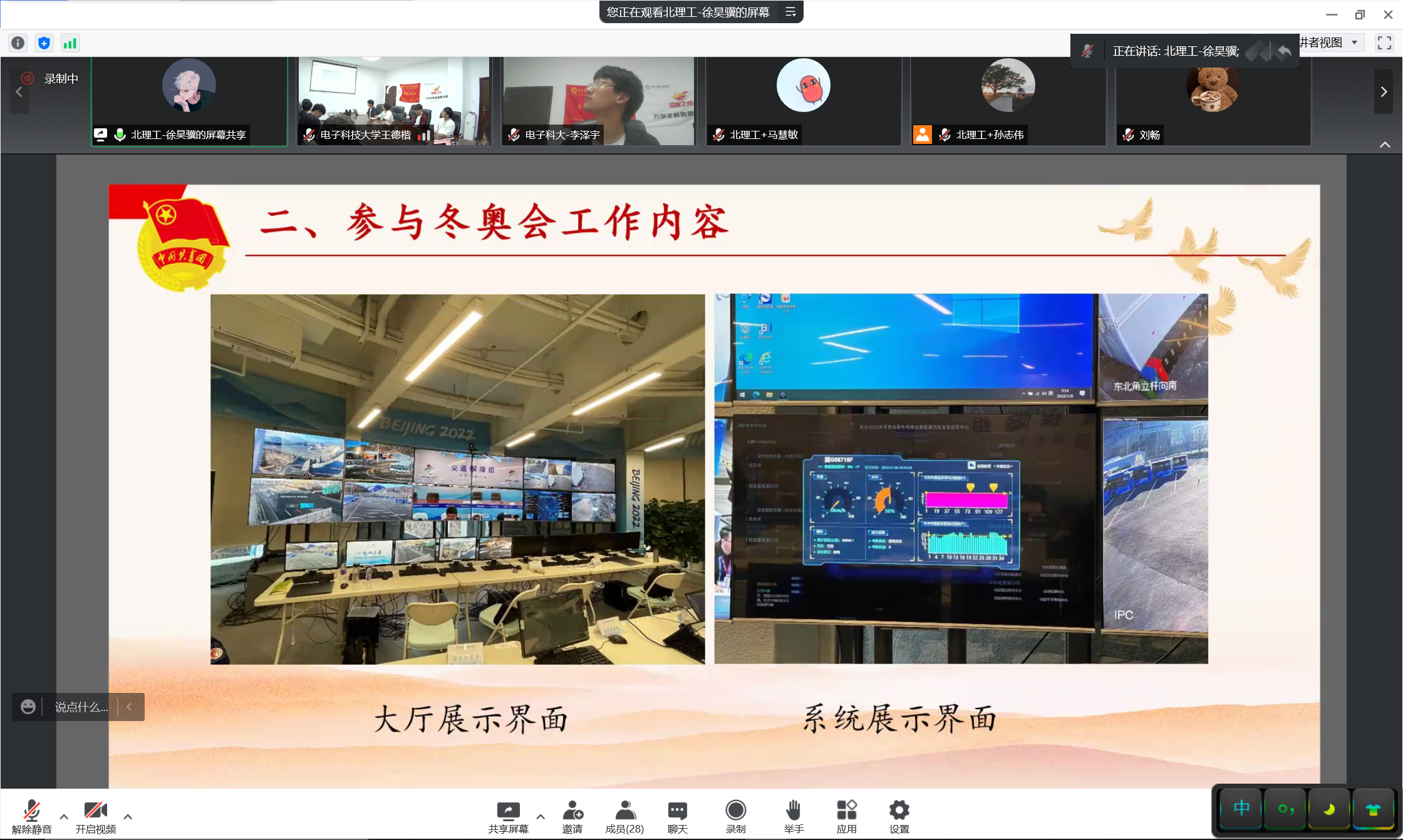 接下来,两支部展开了交流分享。北理工徐昊骥同学分享自己参加北京冬奥会的志愿服务经历和感悟,希望青年们脚踏实地、求真务实,吃苦在前、享乐在后;信通学院 “信仰之光”大学生新思想宣讲团李泽宇同学以“峥嵘六秩不忘初心,立德树人牢记使命”为题进行微党课宣讲,回顾中国共产党百年光辉历程和成电校史故事,表示新一代成电学子定不负韶华、不负期望,成为有理想、有本领、有担当的时代青年。
