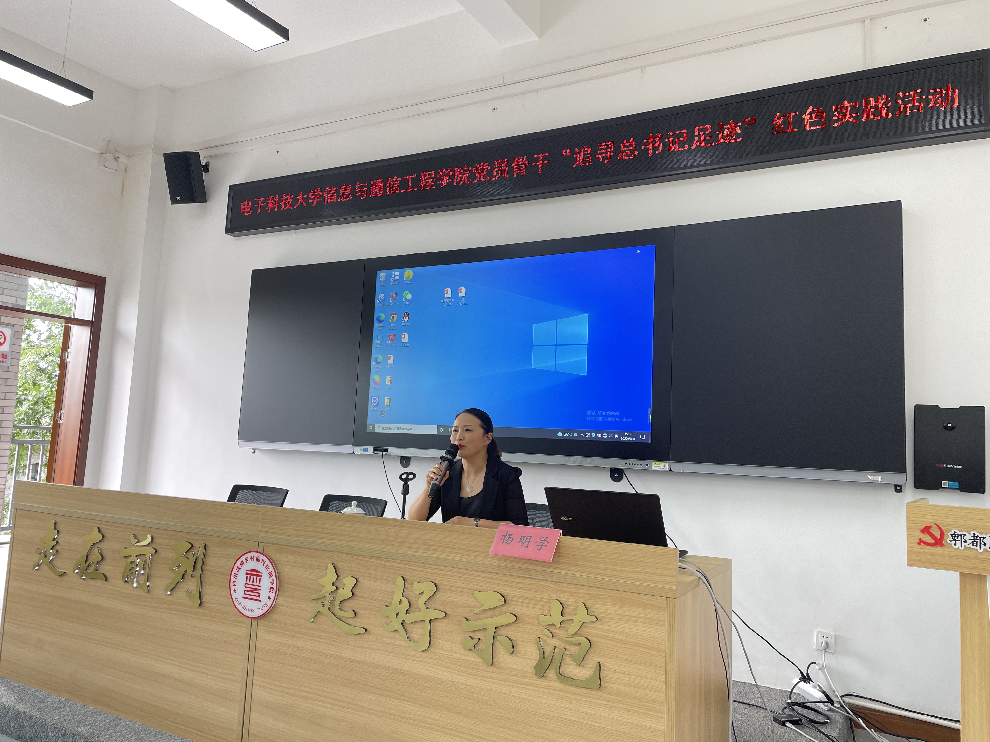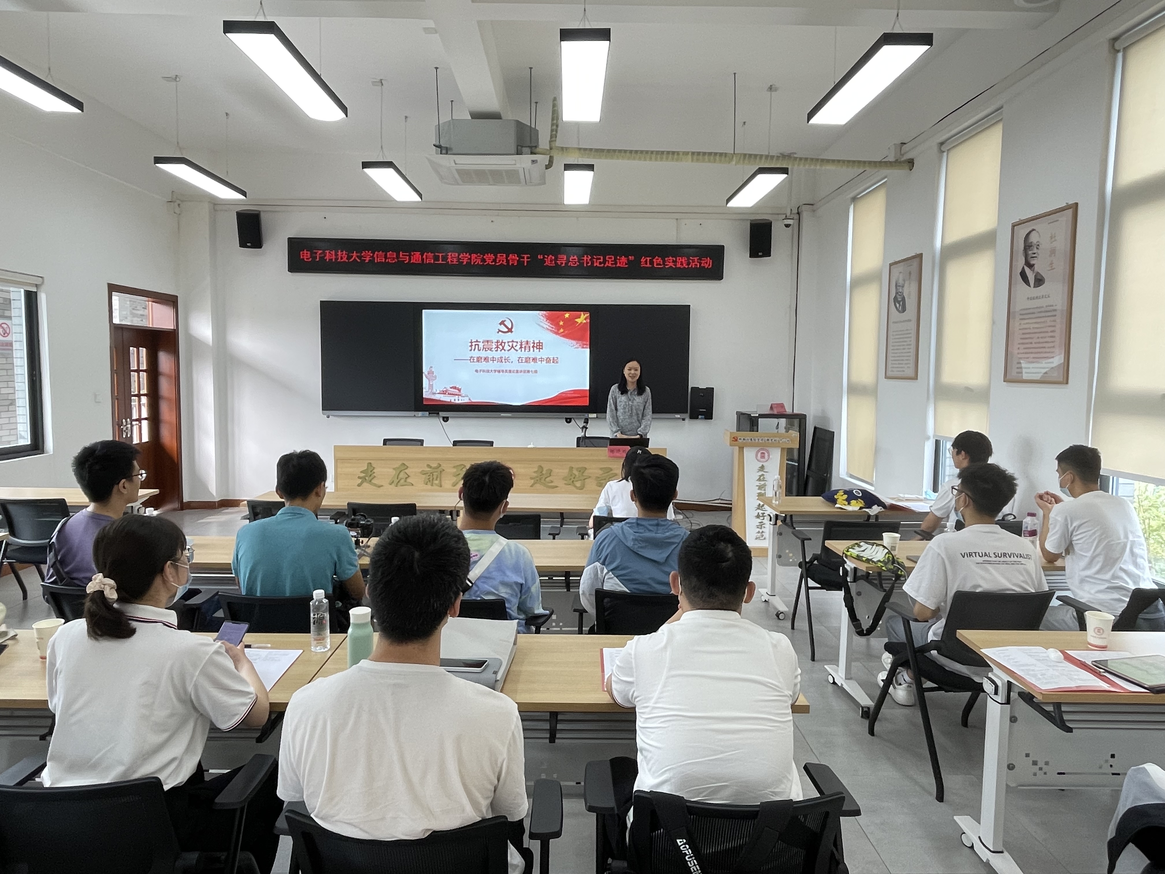 信通学院党委副书记杨晓玲围绕抗震救灾精神进行理论宣讲,通过真实生动的故事讲述了抗震救灾精神的内涵和生动实践以及成电师生在灾难中的担当,同时鼓励在座青年党员们未来能够用实际行动去践行抗震救灾精神。