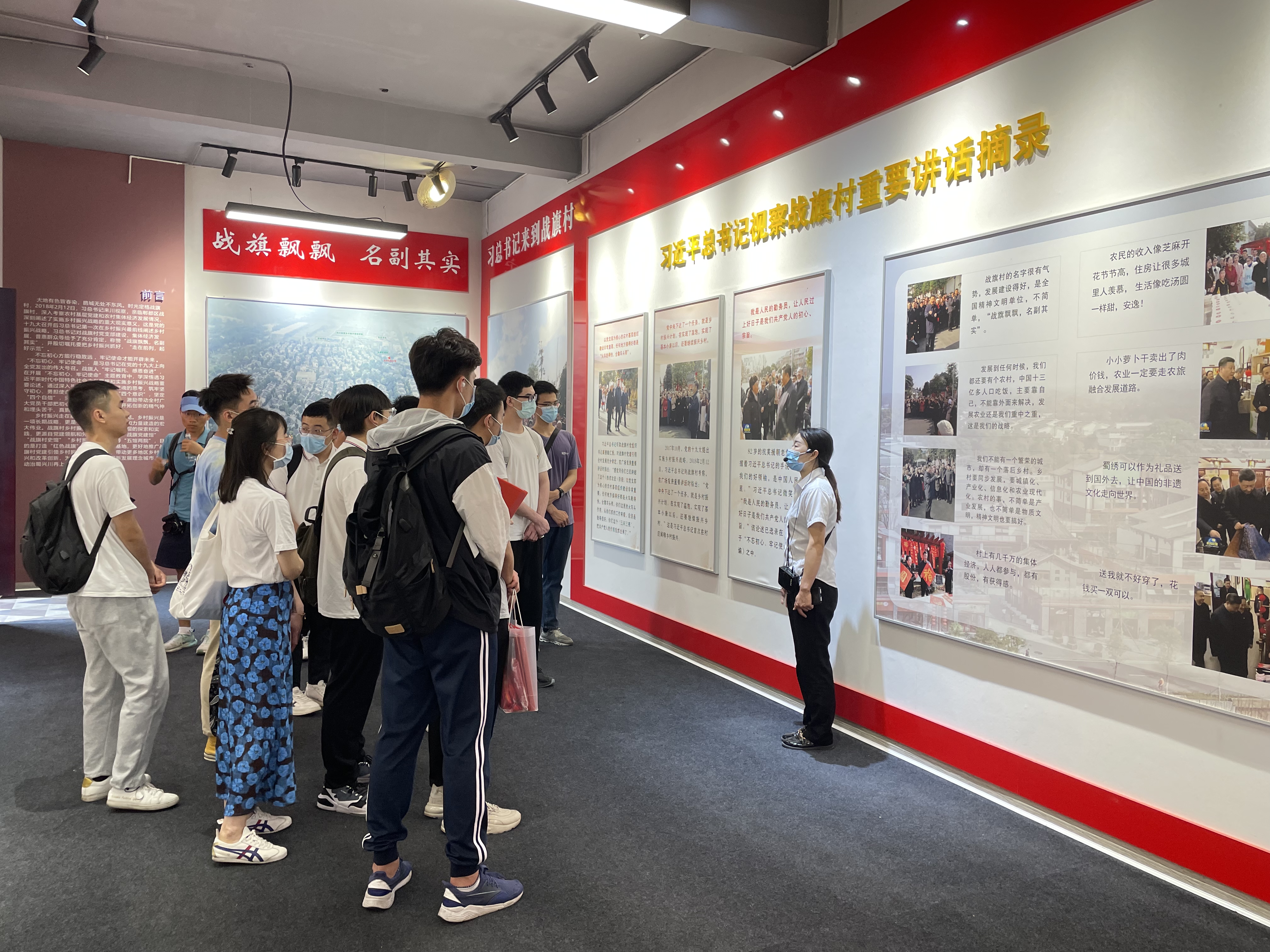 首先,师生们来到党建馆、乡村十八坊、天府农耕文化博物馆等场所,参观郫县豆瓣、圆根萝卜等特色农产品和唐昌布鞋,蜀锦,郫筒酒等非物质文化遗产,同时学习了解战旗村在党建工作、经济发展、乡村振兴等方面的杰出成就。