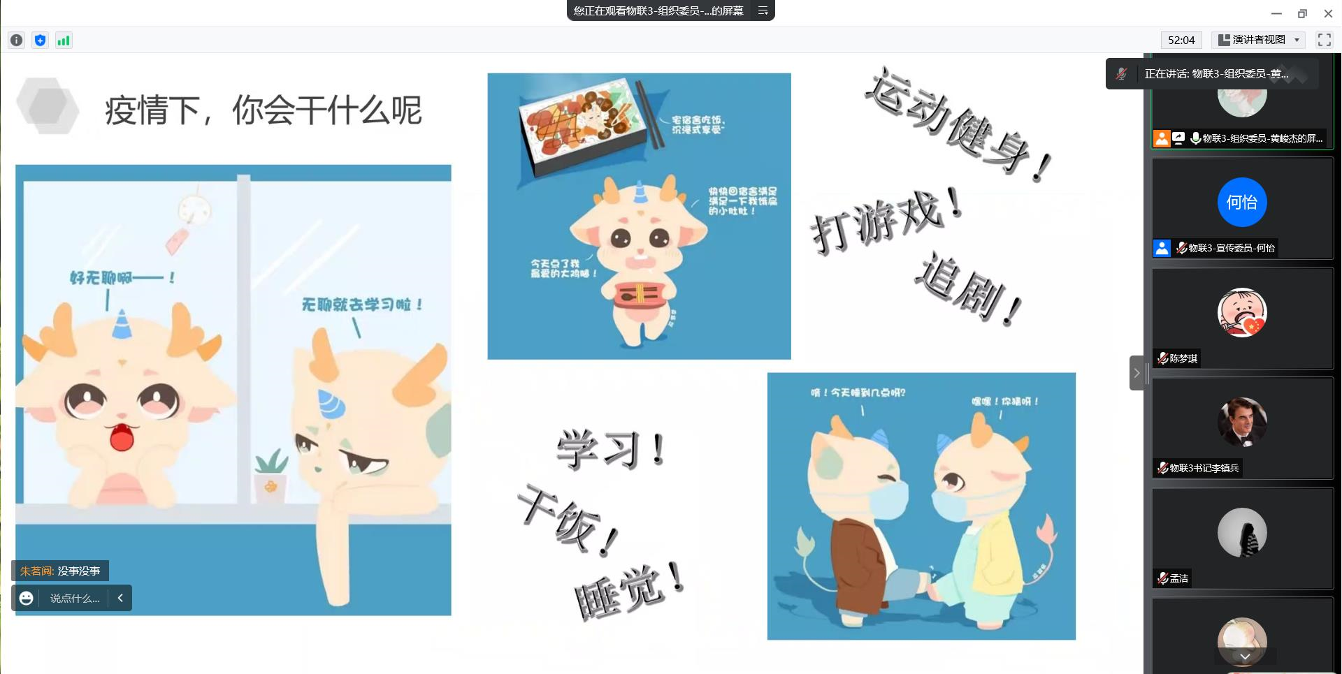 9月3日-4日,学院研究生党支部线上举行“从心行动,共抗疫情”、“线上趣味比拼”等主题党日活动,向新生党员介绍团队科研情况、进行选课指导,同时分享自制跳绳、水桶健身等创意活动和有助于舒缓心理压力的图书、电影等,帮助支部成员在疫情期间保持良好身心状态,齐心协力、共抗疫情。
