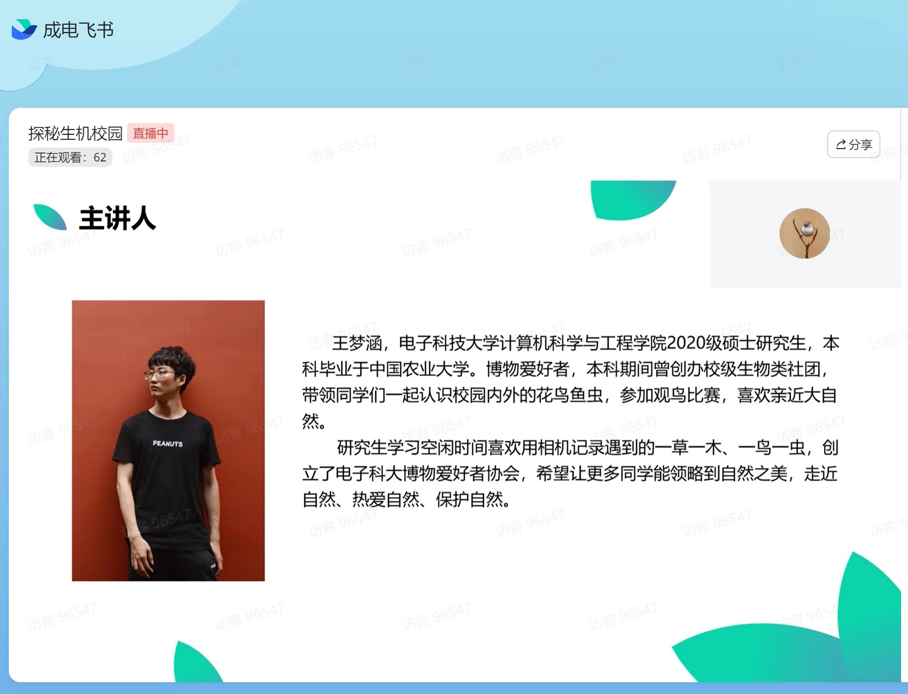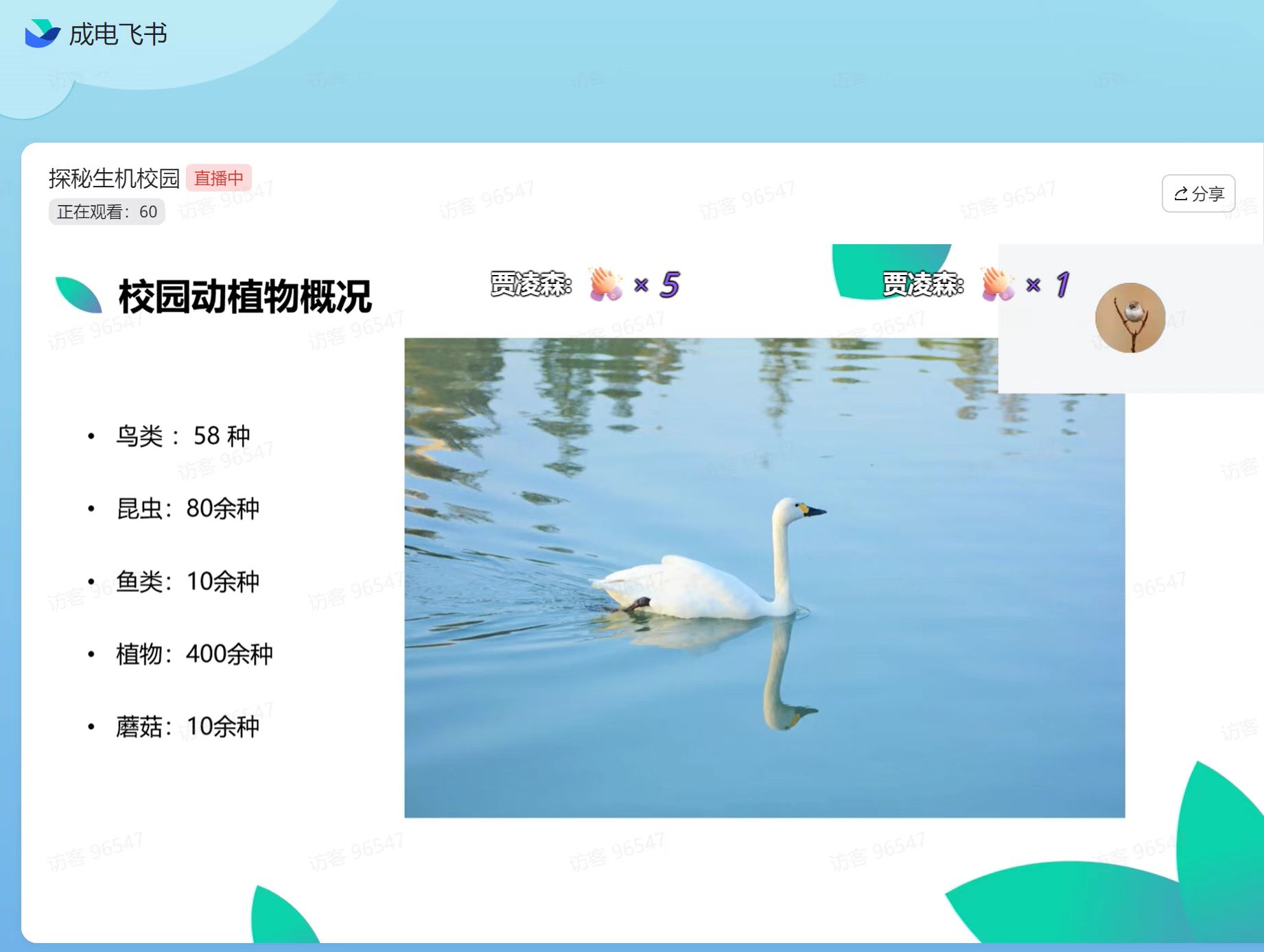 9月4日,学院开展“探秘生机校园”云赏校园活动,邀请学校博物爱好者王梦涵同学,带领大家线上云游探秘校园里神奇的动植物,美丽的翠鸟、优雅的小天鹅、蓝紫色的鸢尾、洁白的木香花,线上感受校园自然之美。