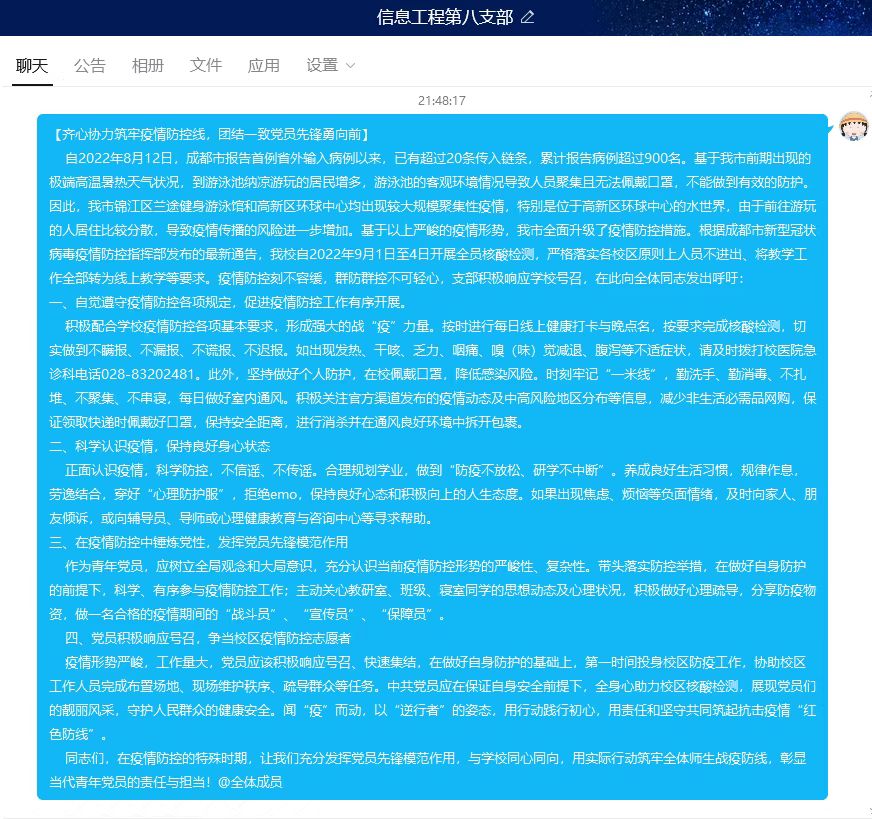 9月3日,学院研究生党支部积极响应学校号召,倡导支部同志自觉遵守疫情防控各项规定,保持良好身心状态,合理规划学业安排。