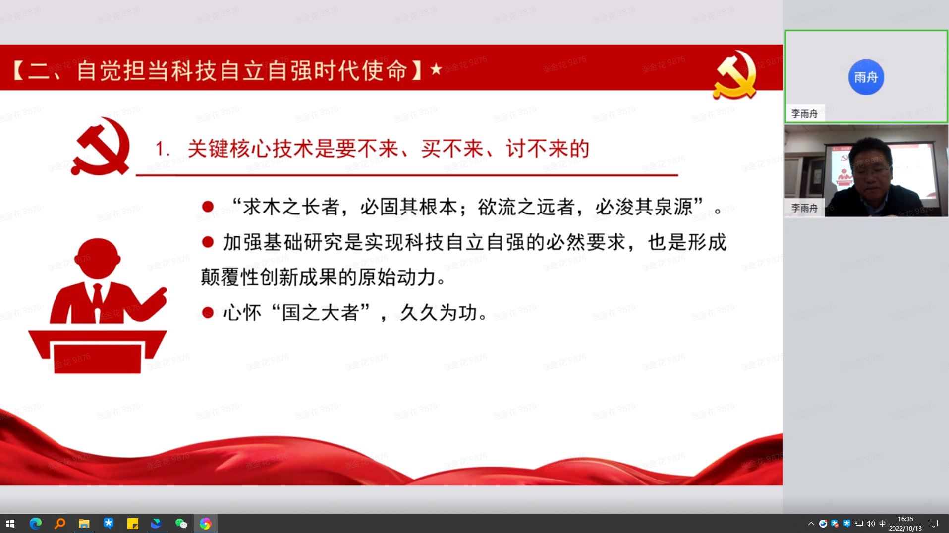 此次讲堂的内容分为以下三个方面:从百年奋斗征程汲取智慧和力量、自觉担当科技自立自强的时代使命和同学发言及讨论。
