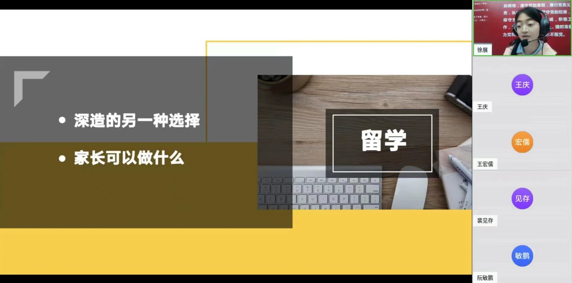 接着,年级辅导员段志秀为家长们分享了留学和就业的相关信息。她举例介绍了留学作为深造的另一种选择所具有的优势,并就家长如何帮助孩子择校提供了思路;针对当前竞争压力日益上涨的就业形势,向家长们提出了三点建议:提醒孩子抓紧就业优势、引导孩子拓宽视野、鼓励孩子突破局限。