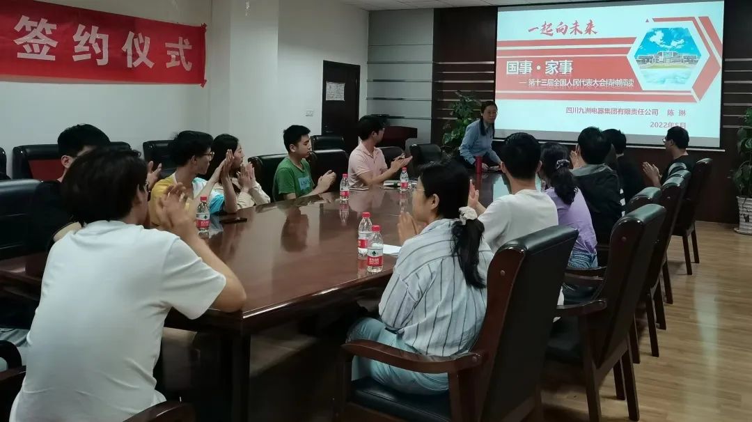 会后举行了第一次校企共建活动。全国人大代表、九洲电器识别事业部党总支部副书记、识别事业部副总经理陈琳校友为支部成员们做了第十三届全国人民代表大会精神解读。她为支部党员仔细讲解了历届全国人民代表大会通过的重要决议与精神,并从自身经历出发,讲述了人民代表的选举过程以及全国人民代表大会制度的重要性。最后陈琳同志以一名国防科技工作者的身份,为大家讲述了国防科技工业发展的必要性、重要性以及国家在科技创新方面的政策,她表示:人才是国家科学创新的源泉,国防科技工业是国家重要的战略支柱性产业,也是国家在高新技术发展最前沿、最敏感的领域,希望各位同学积极投身国家科技创新事业,并将其作为毕生奋斗的事业,为国家发展添砖加瓦、发光发热。