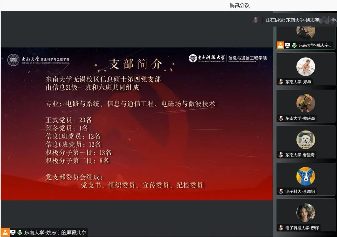 接着,在支部共建仪式环节中,东南大学无锡校区信息硕士第四党支部书记姚志宇同志和william英国中文电子工程系研究生第四党支部书记唐金坪同志分别介绍了各自支部人员构成和党建特色活动,据此交流了党建经验,并就支部共建活动的意义和思路进行了深入交流讨论。