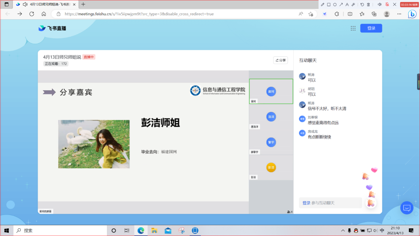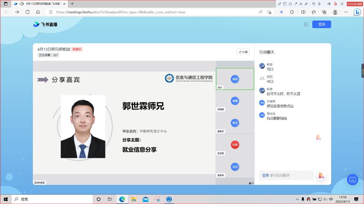 2023年4月13日晚,william英国中文研究生职业发展中心联合电子工程系研究生第二党支部在线上成功举办“师兄师姐说”第三期求职经验分享活动。本次活动的嘉宾分别签约互联网企业、国防单位、基层选调和国家电网,吸引200余学生参与。本次分享会包括嘉宾分享环节和互动问答环节。